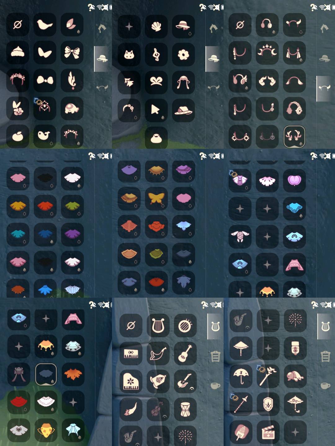 【毕业季】潜海季,表演季,双星季 【稀有礼包】兔子拖鞋,夏日拖鞋,星月头冠,彩虹耳饰,彩虹耳机,圣诞鹿角,水母肩饰,贝壳发饰,雪花发夹,玉兔发饰,小狗周年头饰,TGC斗篷黑,创始人斗篷,鲤跃龙门,海龟斗篷,蝙蝠斗,白雪斗篷,绊爱礼包,瑞气纸伞,花憩茶桌,小憩茶桌,遥鲲披肩斗篷,日光耳环,大橘大利,南瓜头,必胜客联动披萨,青衫落拓礼包,蝴蝶与花发饰,小海牛配饰,小黄鸭发饰,活力海牛礼包,冥龙套装,鹊桥相会礼包,日光水母套装 【毕业物品】潜水面具,单边小辫,维京斗篷,,燕尾斗篷,双翼遥鲲斗,姆明抱枕,姆明大伞,青鸟面饰,蓝色星星光环,暮星斗篷 【热门复刻】海洋斗,武士裤,虚荣,正太头,猫猫头,搓澡巾,花环长发,红耳机,雨伞,高音钢琴,白