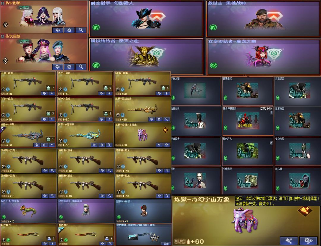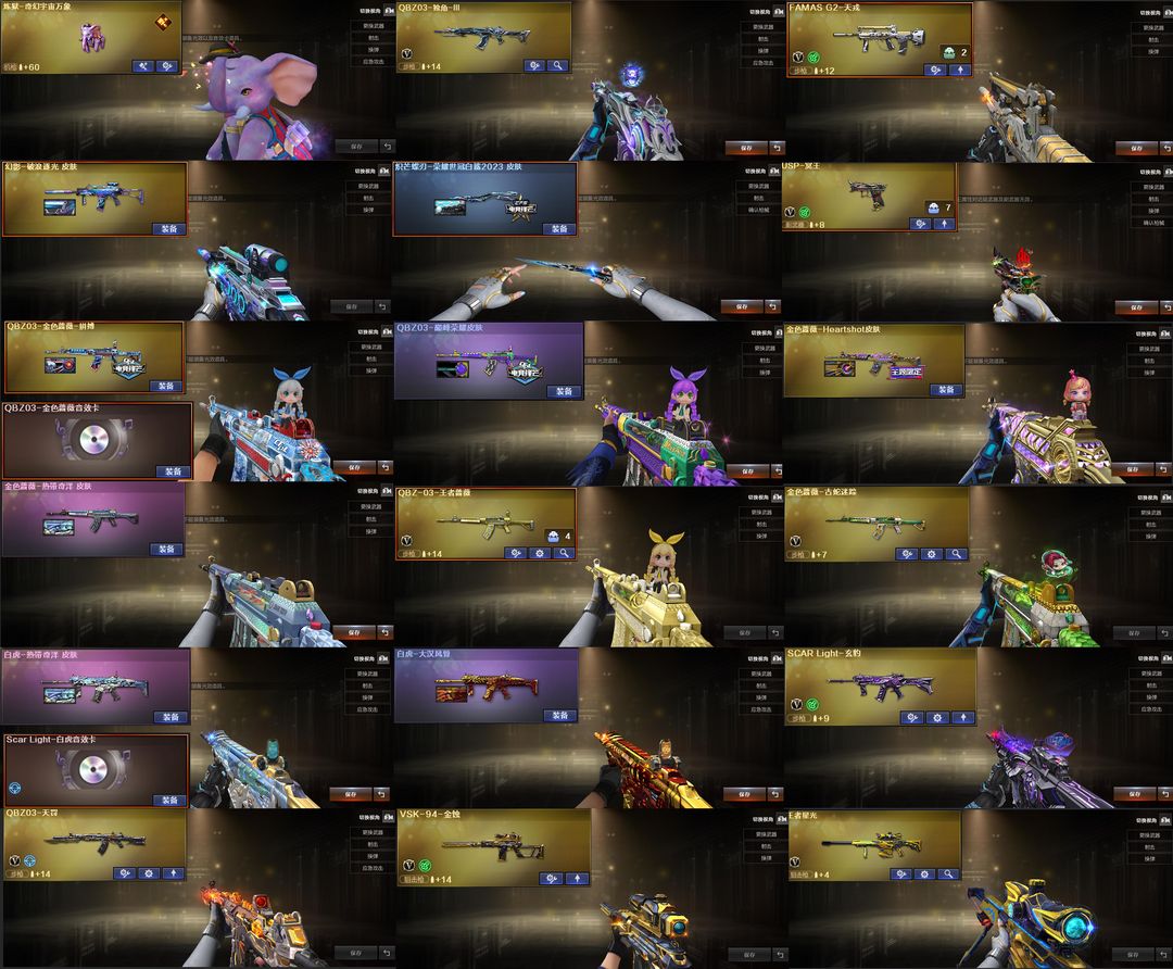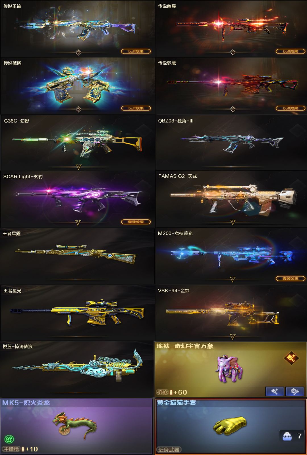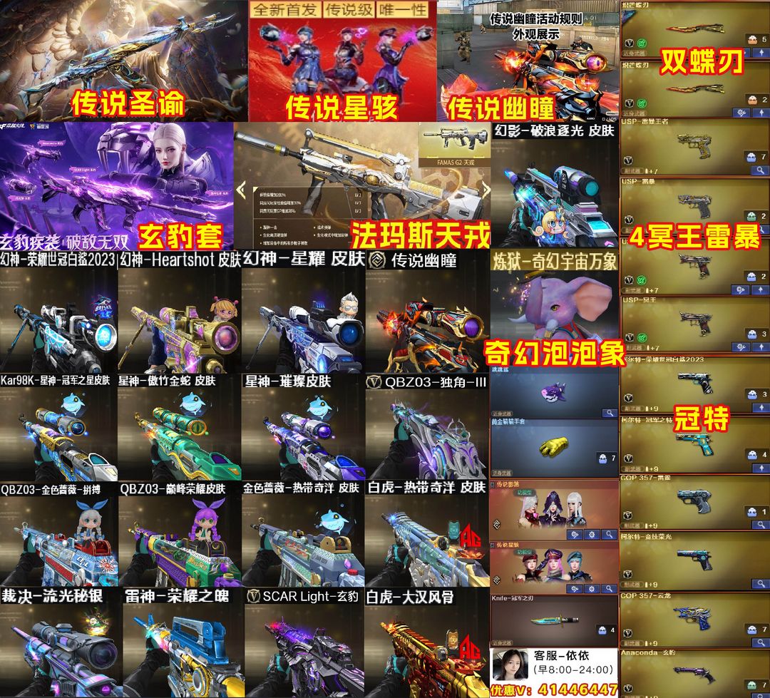 【装备道具】:奇幻泡泡象炼狱❤G36C-幻影❤法玛斯天戎❤3USP冥王❤王者雷暴❤USP雷暴❤传说幽瞳❤传说星骇/传说影煞/传说圣谕/传说梦魇/传说破晓❤白鲨s23幻神❤女团幻神❤星耀幻神/电流骇客幻神❤冠军之星神❤星神傲竹金蛇❤星神璀璨❤王者星霆❤流光裁决音效卡❤全音效卡❤Qbz拼搏/qbz巅峰荣耀/qbz女团/金色蔷薇热带奇洋/王者蔷薇/白虎热带奇洋/白虎大汉风骨/scar玄豹/qbz天罚/王者星光/炽芒蝶刃白鲨/qbz独角/❤M200竞技荣光幻神❤usp雷暴❤满生化❤炼狱音效卡❤星神音效卡/裁决音效卡/白虎音效卡/qbz音效卡/雷神音效卡/黑骑士音效卡/天罚音效卡/火麒麟音效卡/幻神音效卡❤COP雷暴❤柯尔特竞技荣光❤COP云龙❤柯尔特世冠白鲨❤玄豹❤柯尔特冠军之特❤黄金猫猫手套❤MK5-炽火炎龙❤异变清道夫-蛇影双娇❤斯泰尔蝴蝶❤幻影猎人❤6烈龙6盘龙炼狱❤晴雅❤关小雨❤机械姬❤王者岚兮儿❤雷神荣耀之魄❤