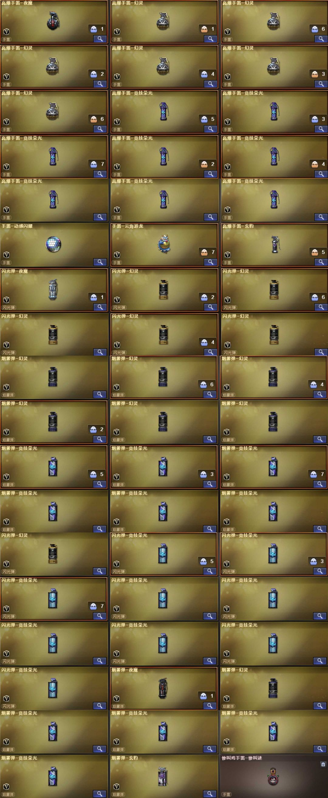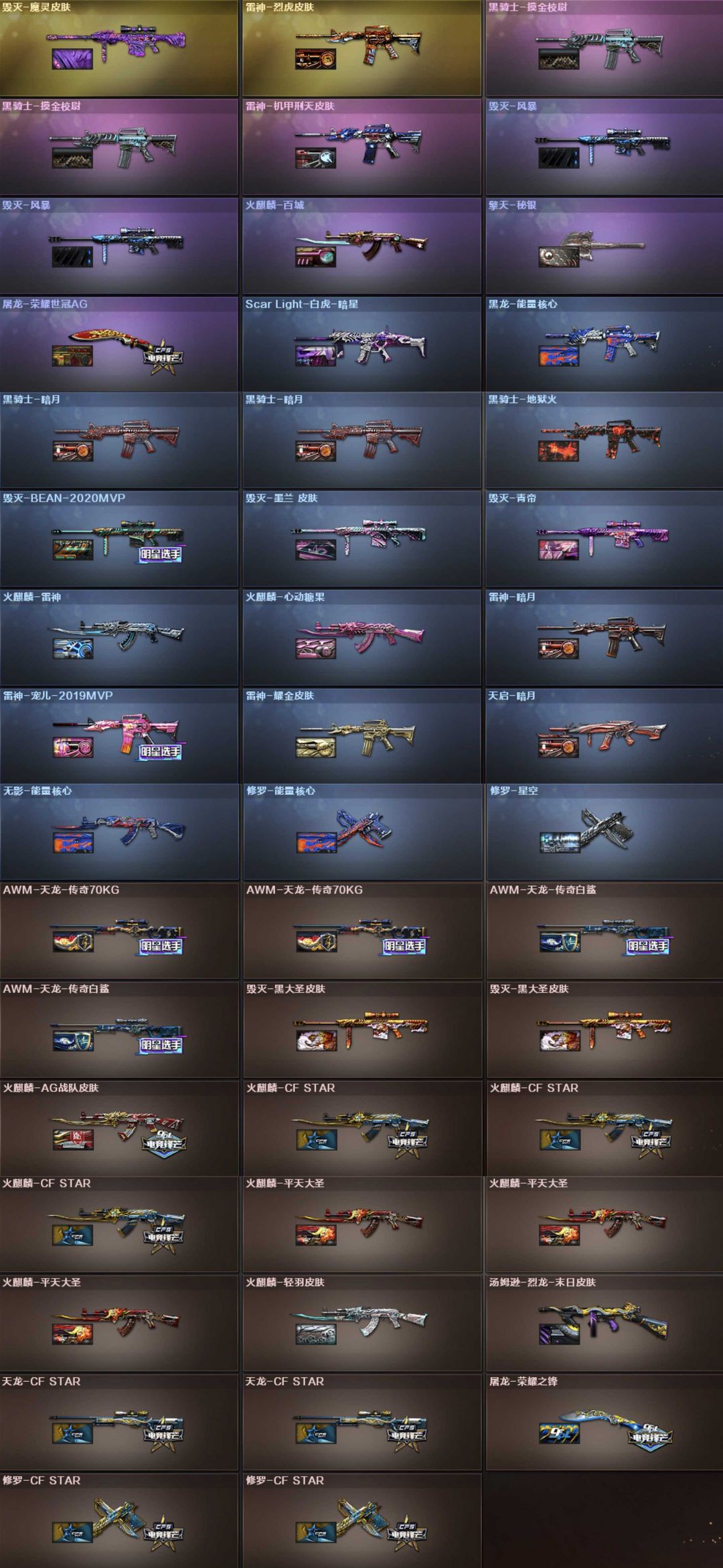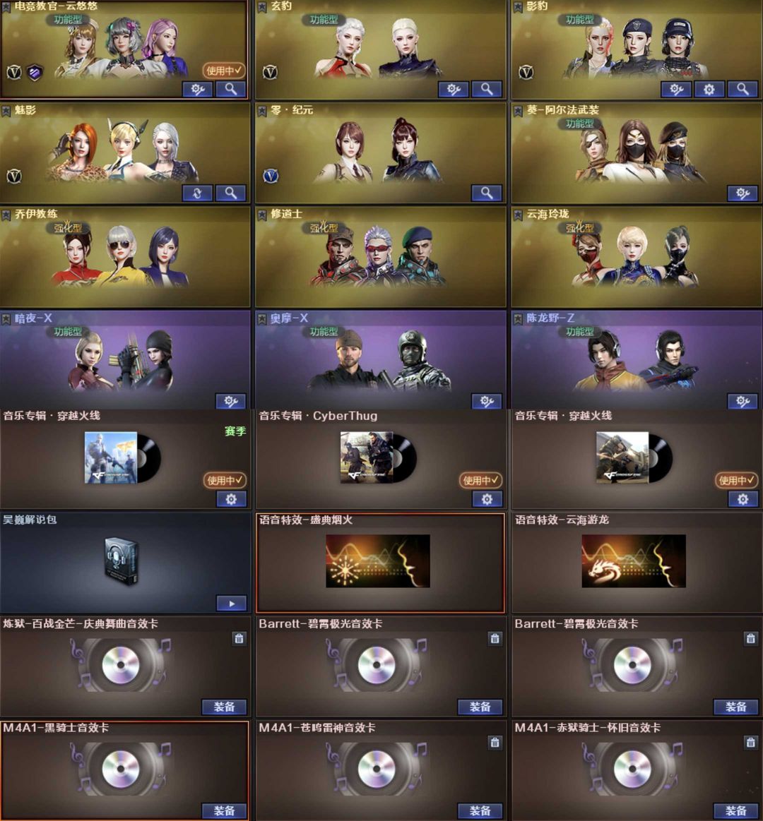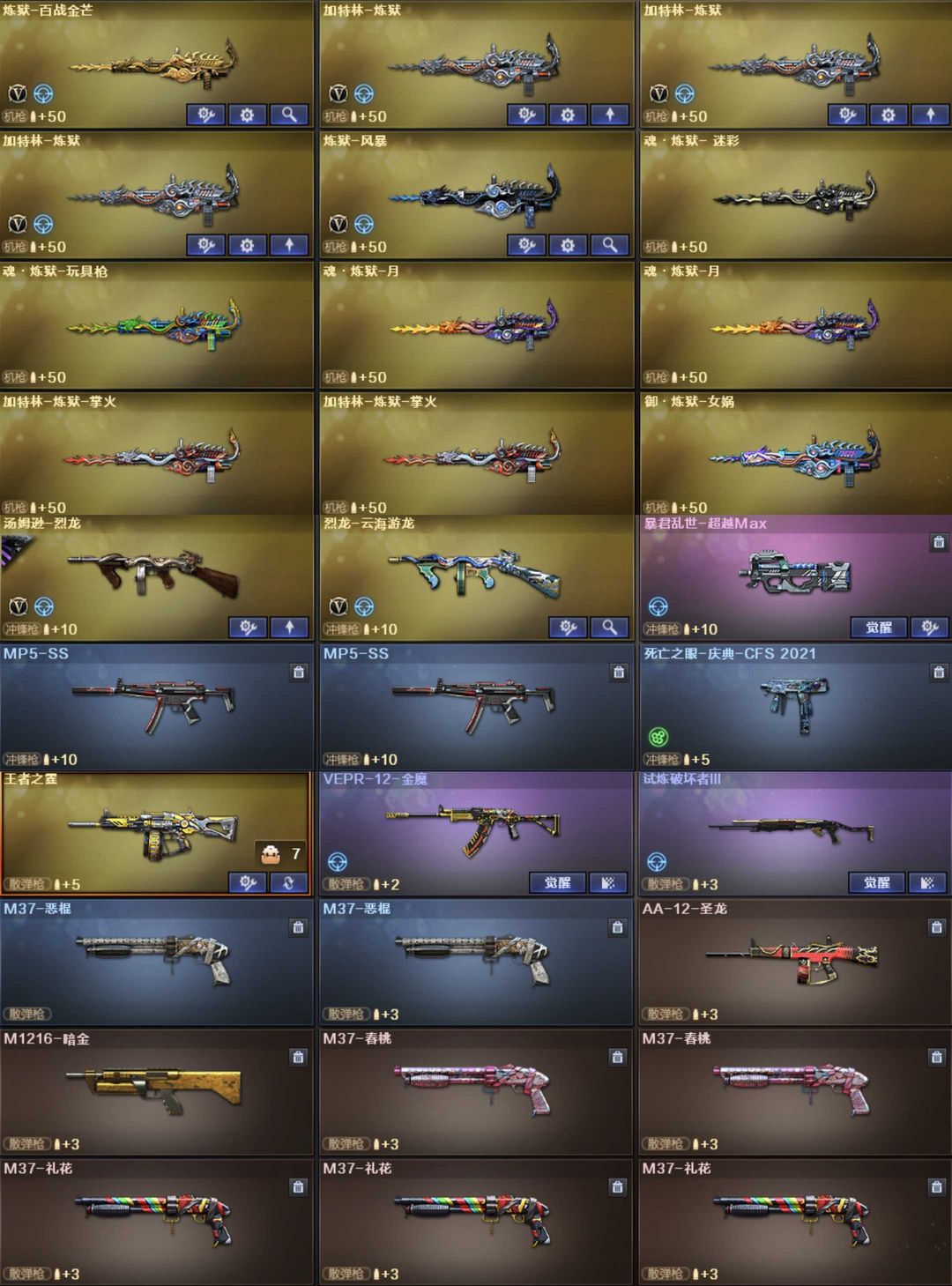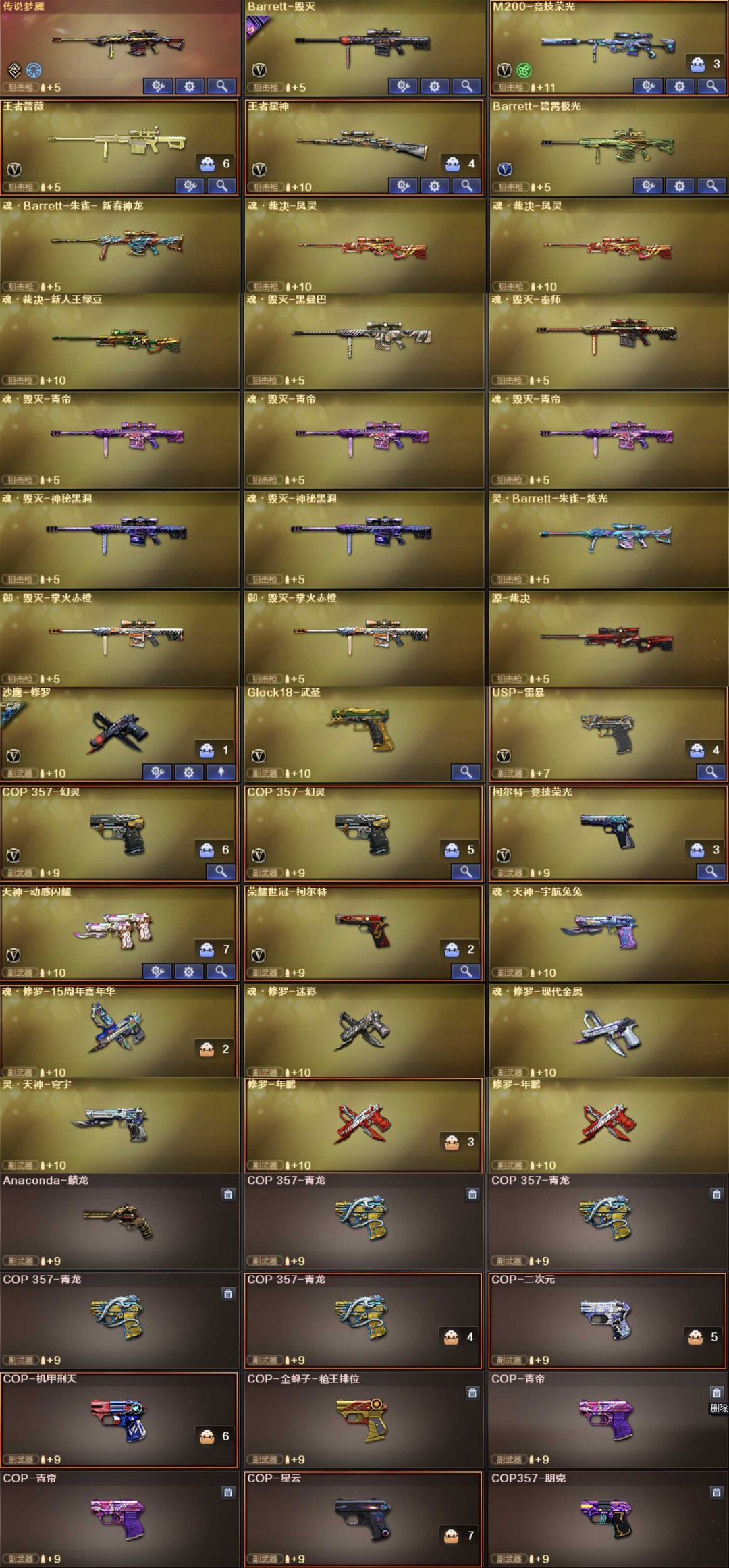 英雄武器57个; 王者武器11个。 可以玩爆破号、生化号、特殊装备有:雷神、黑龙、火麒麟、死神、天启、青龙、朱雀、QBZ天罚、QBZ云龙、黑武士锦绣游龙、高爆手雷-闪光弹-烟雾弹-竞技荣光、擎天竞技荣光、毁灭、火麒麟、黑骑士海王、AA12雷霆、麒麟刺、COP幻灵、QBZ蔷薇、幻灵之锋、幻神、QBZ王者蔷薇觉醒、王者冰魄觉醒、王者白虎觉醒、炫金火麒麟、王者猎神、王者星霆、王势觉醒、炫金天神、炫金毁灭、魂麒麟刺萌杀、枪王之刃、魂巴雷特金色蔷薇蛇姬、灵巴雷特金色蔷薇甜蜜火力、魂·QBZ蔷薇蛇姬、灵·QBZ蔷薇嘉年华、魂超新星春桃、源武圣、源玫瑰精灵、源巴雷特朱雀、源毁灭、源金色蔷薇、源炼狱、御黑骑士哪吒闹海、斯泰尔巧克力、黄金M14EBR、MK5SS、御黑武士烈虎、双面神、异变清道夫、斯泰尔维纳斯、G36C宇航兔兔、御·超新星圣诞、黄金AK47、黄金M4A1、死亡之眼、斯泰尔英特尔、M4A1玫瑰、AK47破空冰刃、斯泰尔正义、御·黑骑士冰魄、源武圣glock、Colt1911宇航兔兔、柯尔特涂鸦、COP357、堕天使、王者凌霄、极光音效、生化弹夹