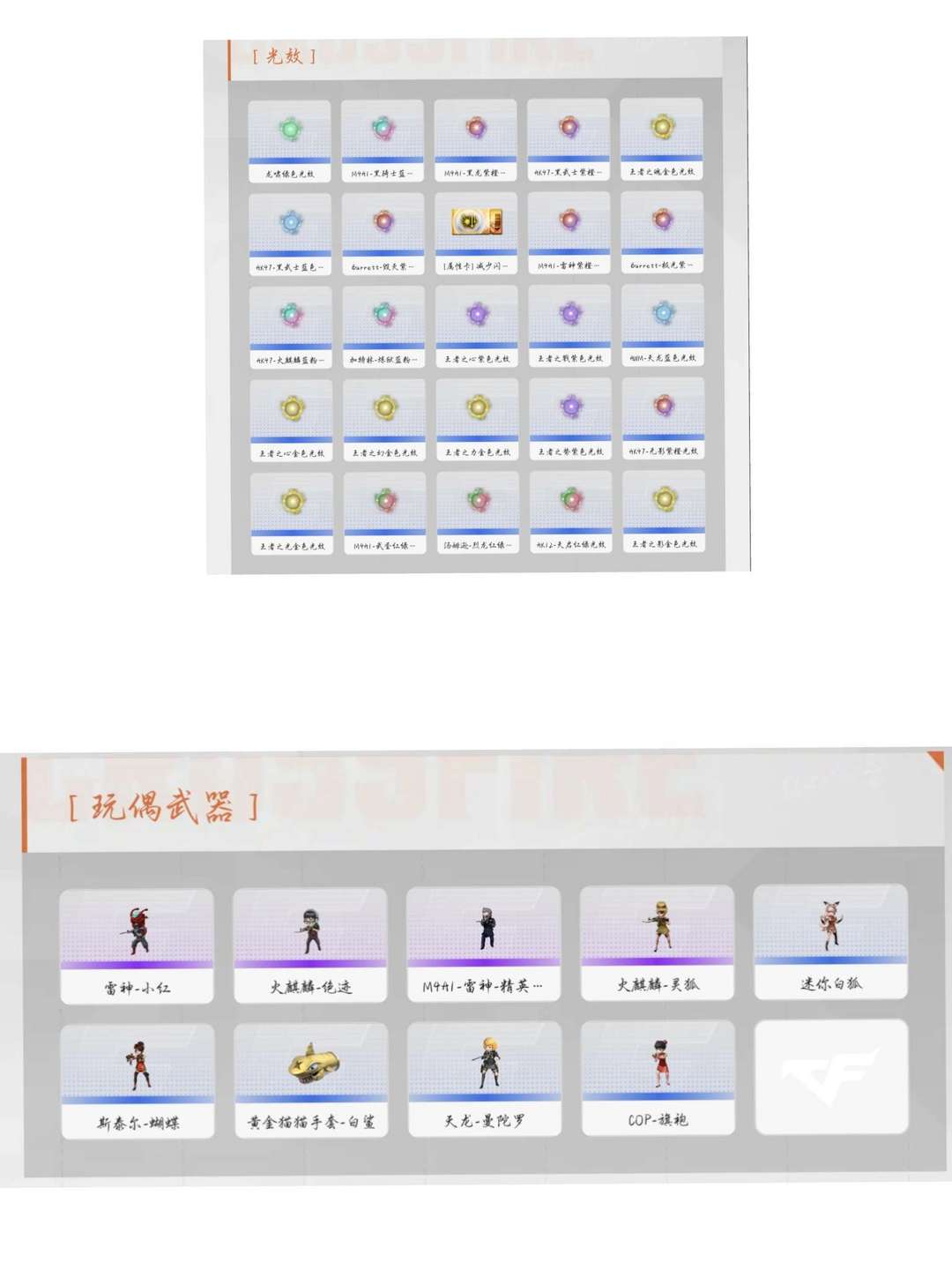 本游戏账号:英雄武器101个; 王者武器44个。 主副武器、近身武器带各皮肤及玩偶,各角色拥有完美游戏体验。重要的是,特殊装备有:加特林-炼狱、柯尔特-竞技荣光、烟雾弹-竞技荣光、高爆手雷-竞技荣光、黑骑士-海王、M4A1-黑骑士、Scar Light-白虎、传说暗裔、擎天-竞技荣光、AK47-黑武士、Kar98K-星神、QBZ03-金色蔷薇、M200-竞技荣光、幻灵之锋、AK47-火麒麟、闪光弹-竞技荣光、Barrett-毁灭、传说辉光、AWM-天龙、COP 357-幻灵、M4A1-夜魔、M4A1-雷神、COP-堕天神、AA-12-雷霆、M4A1-黑龙、麒麟刺、M4A1-青龙、M200-幻神、Barrett-朱雀、M14EBR-玄武、炫金武士、王者之势、王者之势-觉醒版、王者之幻、王者之力、炫金骑士、王者之魂、王者之心-觉醒版、王者之影、王者之圣、王者之锋、炫金黑龙、王者之怒、炫金雷神、炫金火麒麟、王者之城、王者之魄-觉醒版、王者霜心、王者冰魄、炫金毁灭、王者炎心、王者幻神等等