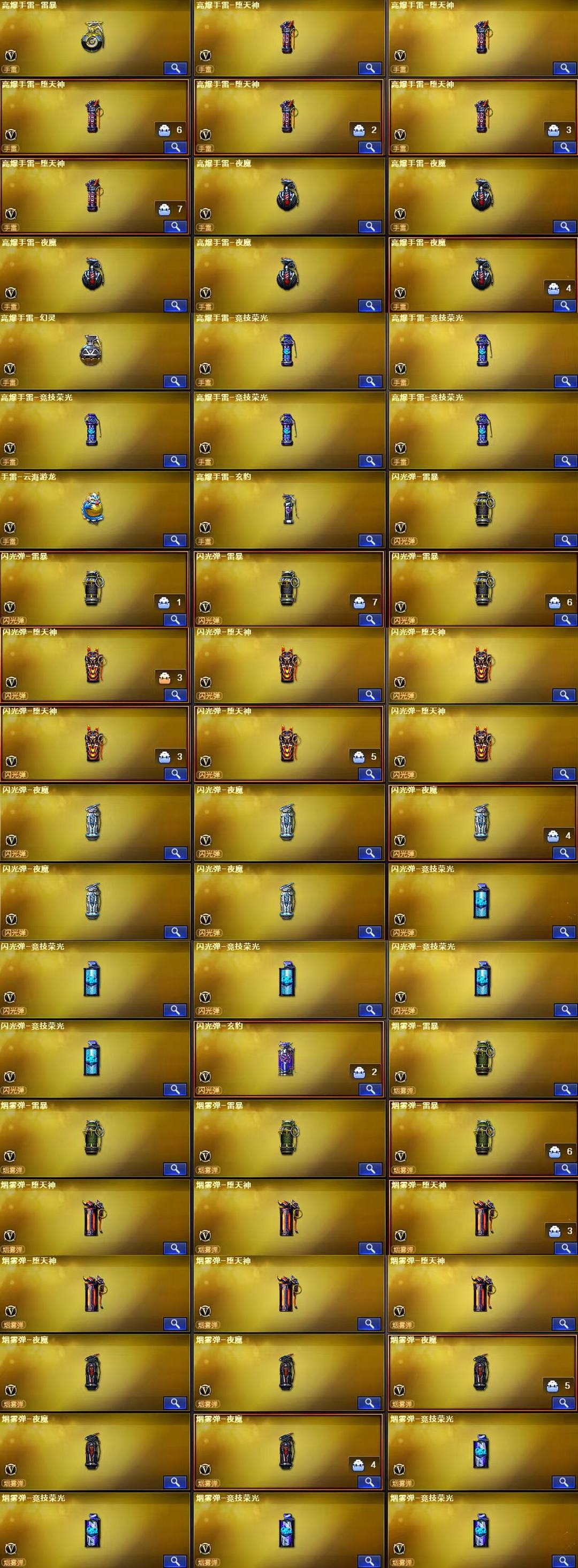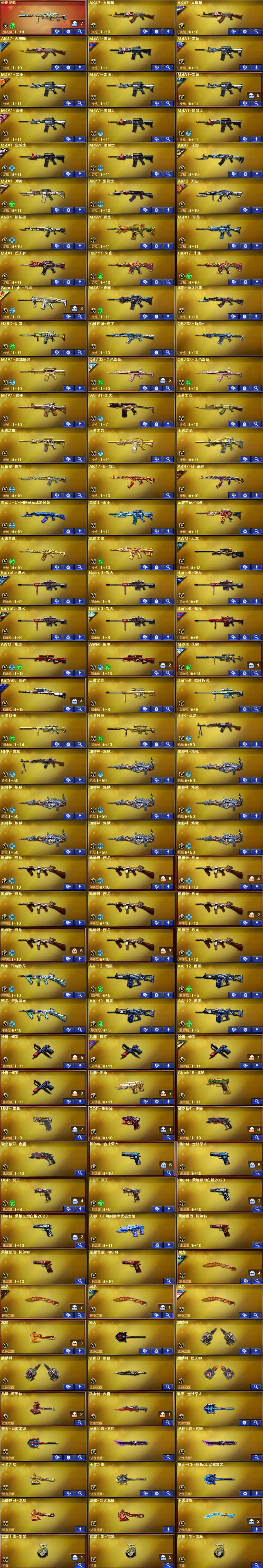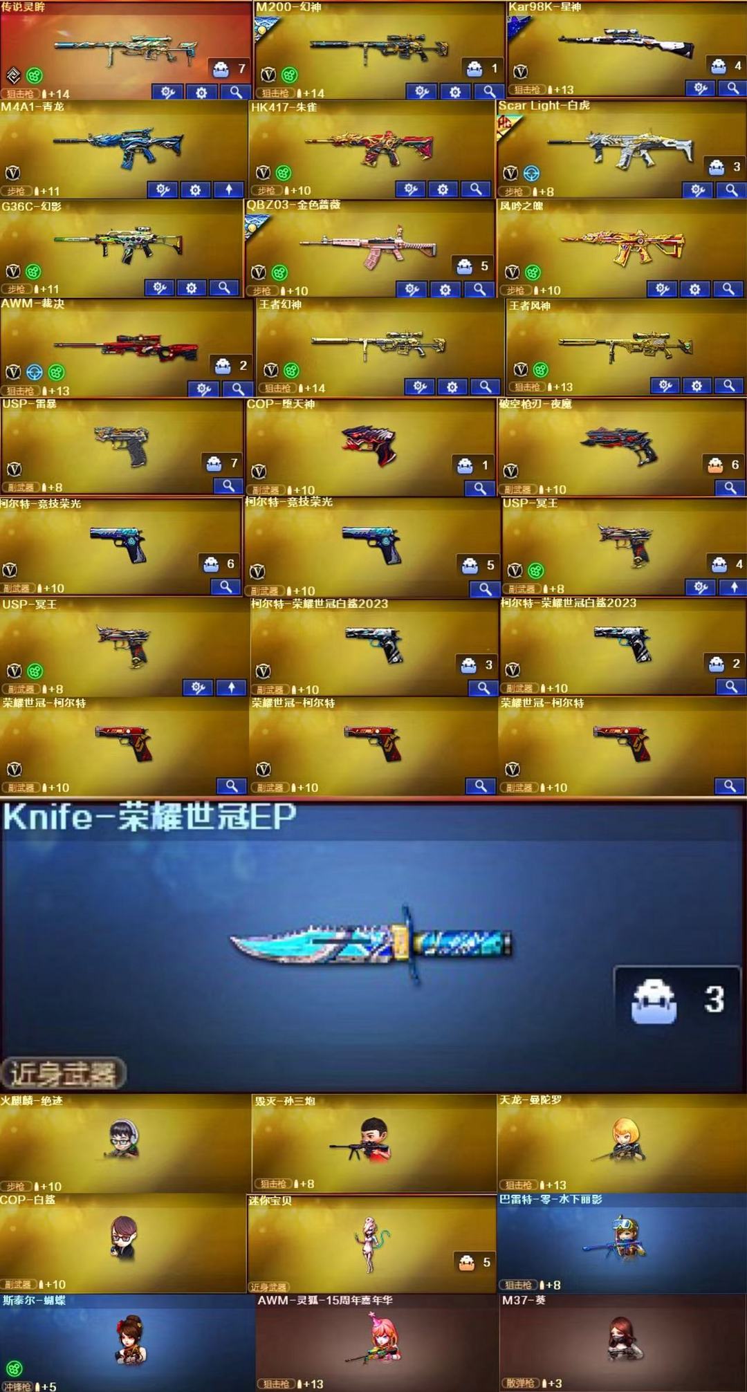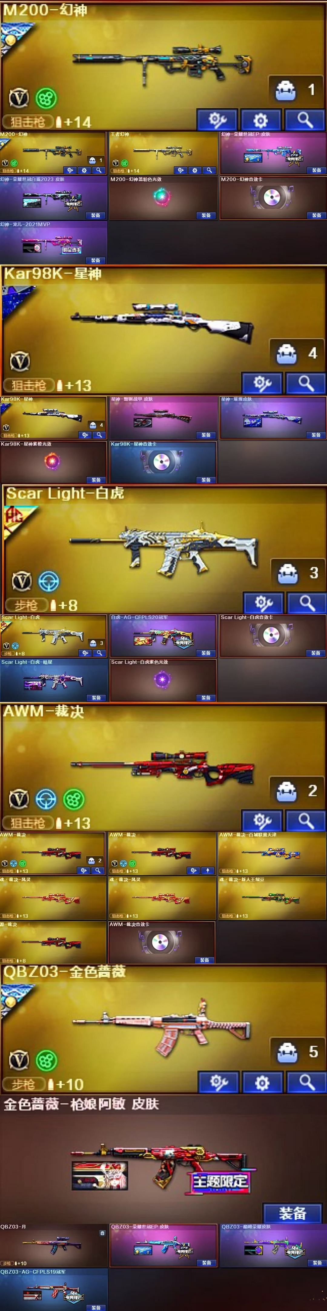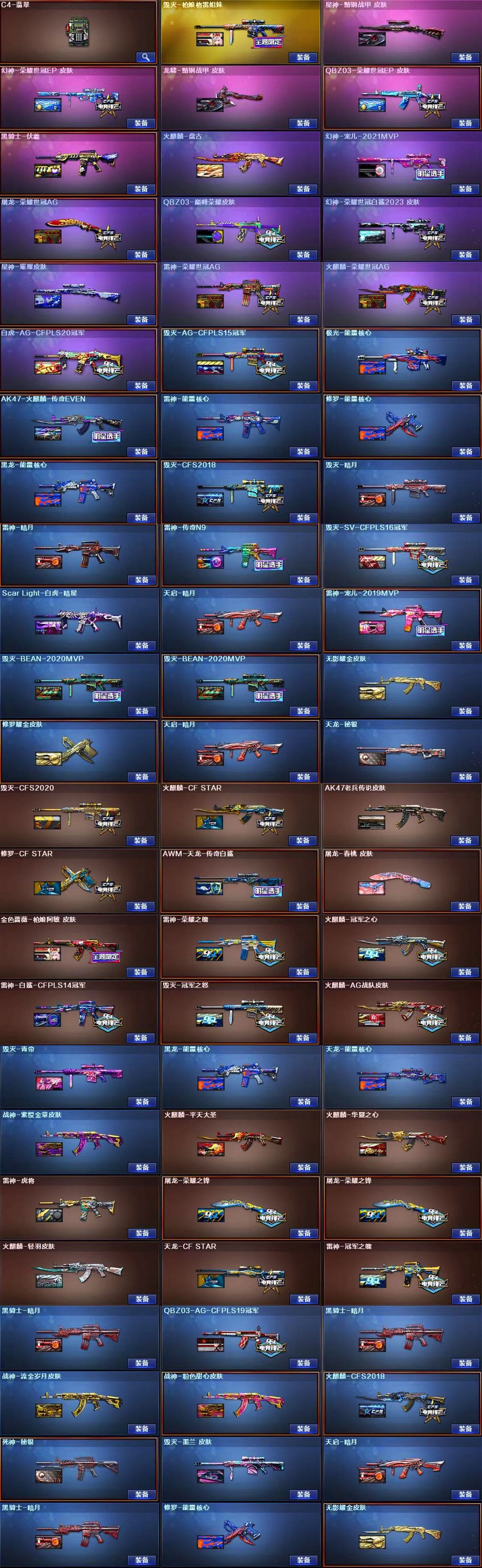 英雄武器:高爆手雷-玄豹;烟雾弹-玄豹;闪光弹-玄豹;丛林匕首-玄豹;USP-冥王;机械迷城-穹宇;柯尔特-荣耀世冠白鲨2023;G36C-幻影;烈龙-云海游龙;手雷-云海游龙;擎天-云海游龙;传说灵眸;高爆手雷-幻灵;龙啸-烈火龙威;QBZ03-金色蔷薇;无影-神兵利器;Barrett-暗月传说;高爆手雷-竞技荣光;闪光弹-竞技荣光;烟雾弹-竞技荣光;擎天-竞技荣光;柯尔特-竞技荣光;AK47-黑武士;M4A1-雷神;M4A1-死神;加特林-炼狱;荣耀世冠-柯尔特;荣耀世冠-龙啸;荣耀世冠-雷神;M4A1-武圣;Glock18-武圣;M4A1-猎神;AA-12-雷霆;黑骑士-海王;Scar Light-白虎;汤姆逊-烈龙;RPK-盘龙;USP-雷暴;高爆手雷-雷暴;烟雾弹-雷暴;闪光弹-雷暴;斩神刀-雷暴;麒麟刺;Kar98K-星神;AK47-无影;M4A1-黑
