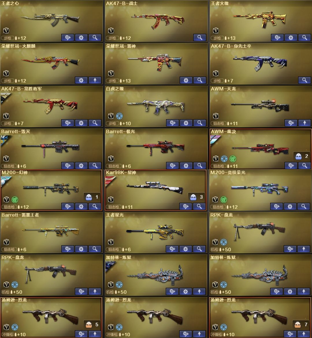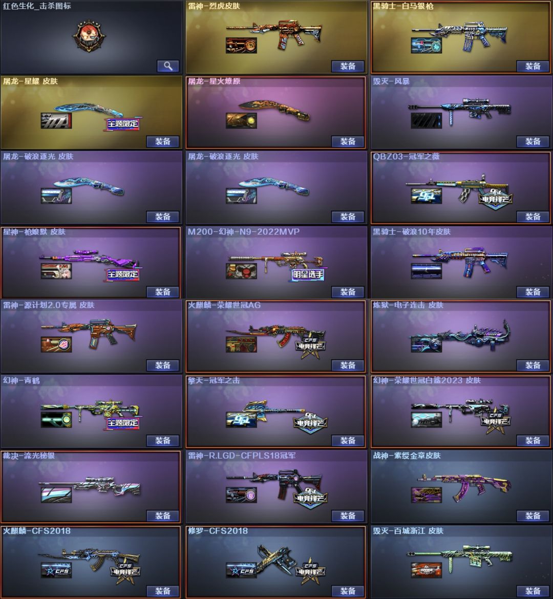 G36C幻影、USP冥王、USP雷暴、冠军柯尔特、COP雷霆王者、幻神N9皮肤/幻神2023世冠白鲨皮肤、幻神青鹤皮肤、八面玲珑、幻神音效卡、裁决音效卡、98K星神音效卡、金色蔷薇音效卡、白虎、六烈龙
