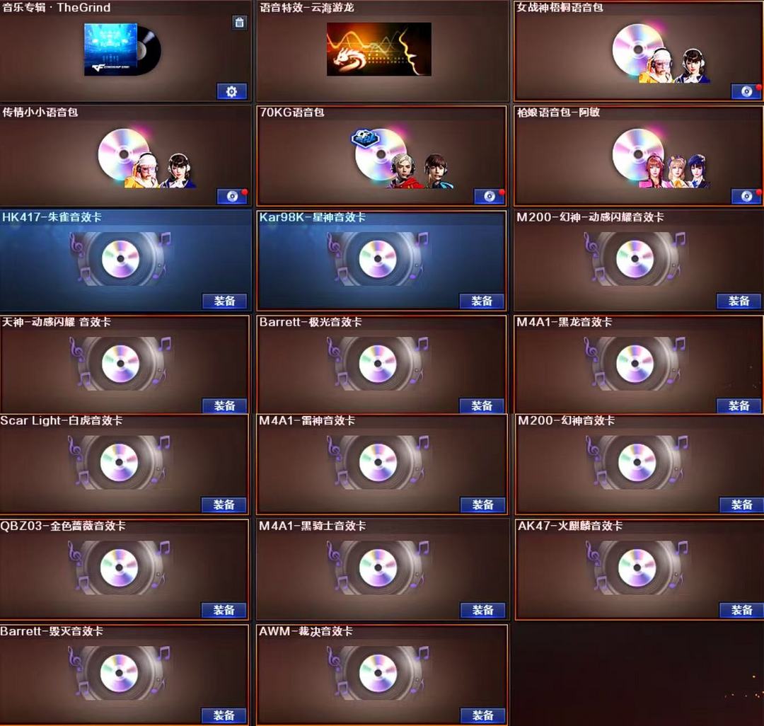 耳机;灵魂忍者;迷雾幽灵;疯狂宝贝;防化服;C4工具钳;手雷包;防弹衣;防弹头盔;夺命之镰;防化服;迷雾幽灵;灵魂忍者;疯狂宝贝;全能枪王黄金面具;彩蝶之翼;M4A1-雷神蓝粉色光效;全能枪王黄金面具;闪光护目镜;C4工具钳;手雷包;防弹衣;防弹头盔;烟雾保护头盔;天使光环;天使之翼;枪娘语音包-阿敏;超级护目镜;黄金头骨护目镜;变相怪杰;防弹头盔;防弹衣;防弹头盔;防弹衣;防弹头盔;防弹衣;C4工具钳;手雷包;生化弹匣;C4工具钳;防弹头盔;防弹衣;手雷包;防弹头盔;防弹衣;手雷包;防弹头盔;防弹衣;防弹头盔;防弹衣;京剧背包;M4A1-雷神紫橙光效;超级背包;变异宝贝;金蛇戒;兔子发带;银蛇戒;Kar98K-星神音效卡;HK417-朱雀音效卡;Barrett-极光音效卡;天神-动感闪耀 音效卡;QBZ03-金色蔷薇音效卡;AWM-裁决音效卡;M200-幻神音效卡;M4A1-雷神音效卡;Scar Light-白虎音效卡;M4A1-黑龙音效卡;M4A1-黑骑士音效卡;AK47-火麒麟音效卡;Barrett-毁灭音效卡
