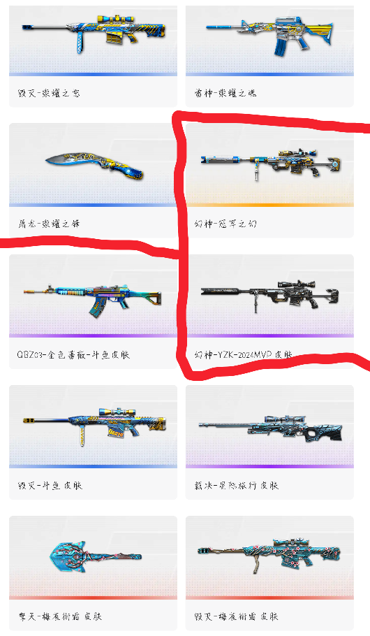 幻神(KYZ)(冠军之幻)➕双冠军之特.白虎➕音效卡.裁决➕音效卡.星神-炽天使.隼(四防)G36c幻影.qbz191银翼.qbz金色蔷薇.毁灭➕音效卡(皮肤) 王者之刺 王者之武 斩神刀雷暴 王者魅影(四防)荣耀冠军套