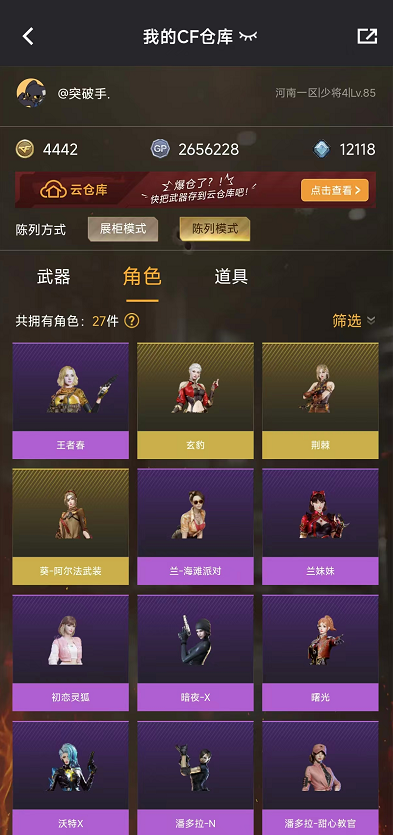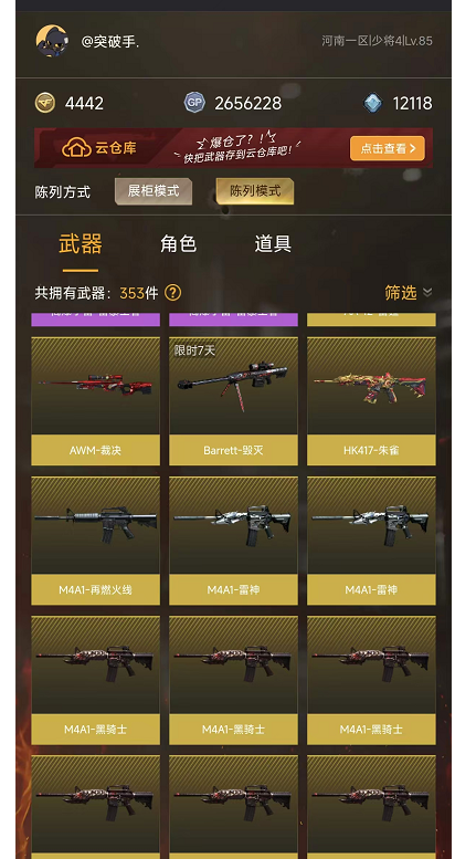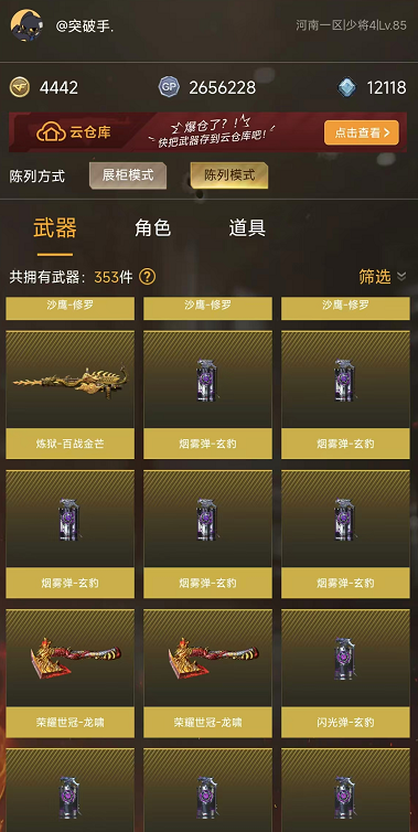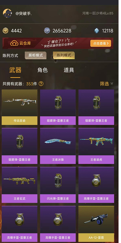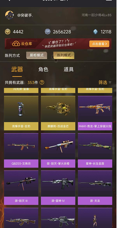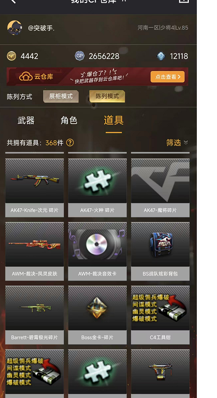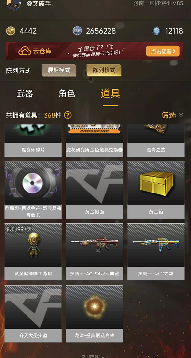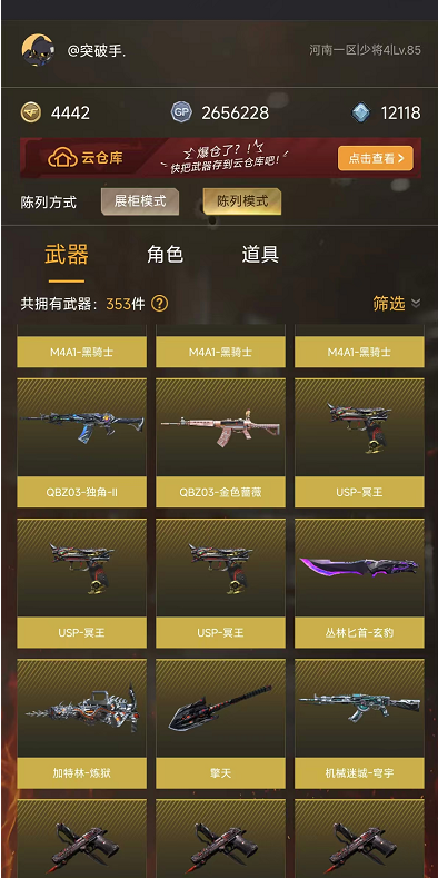 本游戏账号:英雄武器52个; 王者武器6个。 可以玩爆破号、生化号、双全装、稀有武器、等模式。装备不多,但是主武器、副武器、近身武器够用 拥有完美游戏体验。重要的是,特殊装备有:黑骑士-海王、M200-幻神、AK47-火麒麟、炫金毁灭、王者之魄-觉醒版、王者之力-觉醒版、王者之锋-觉醒版、职业选手、王者影豹、雪莉杨、堕天使、炼狱-悦蓝金色光效、王者之啸金色光效、王者之魄金色光效、M4A1-雷神音效卡、生化弹匣、等,随意畅选。