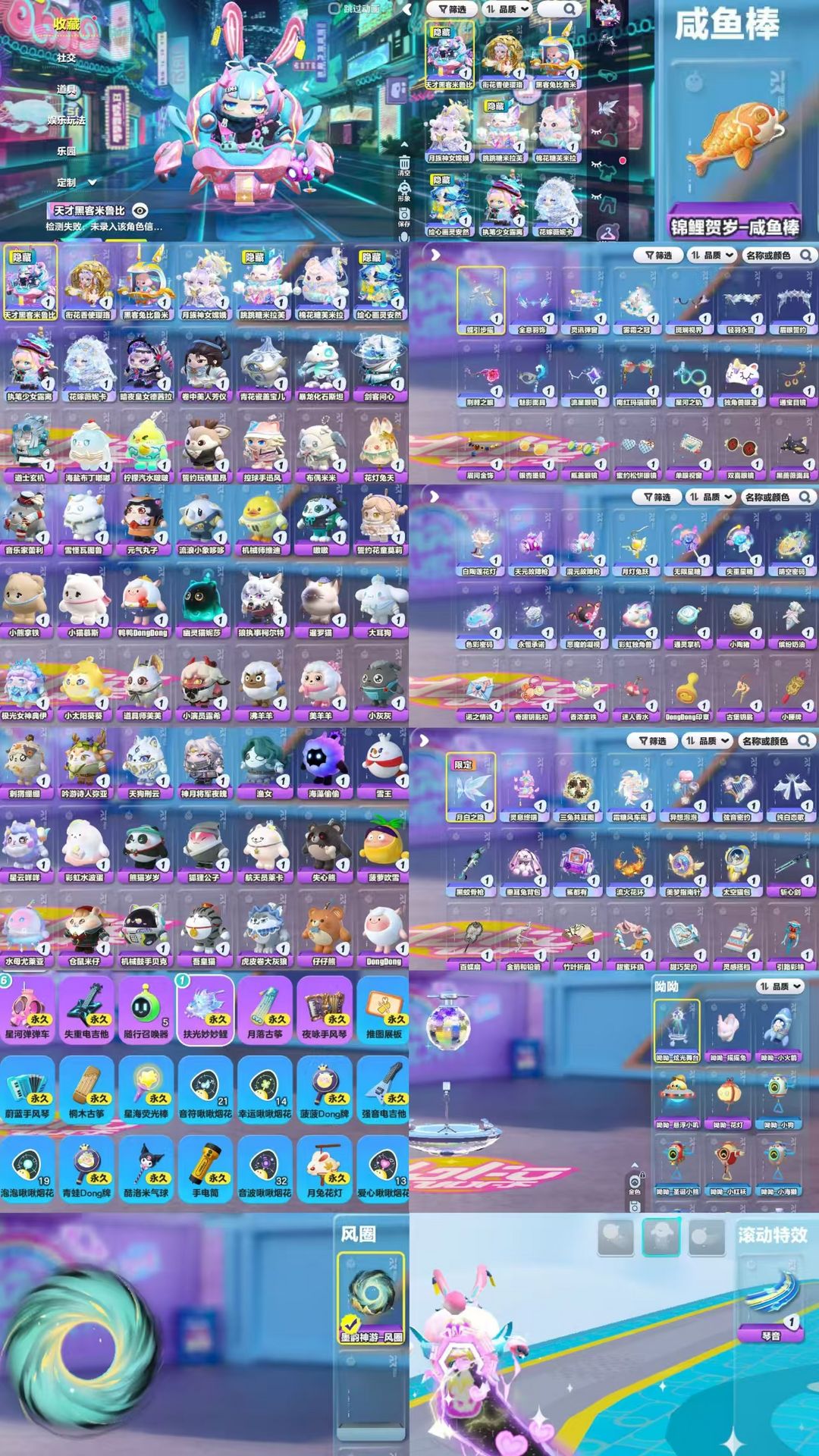 ☀️绘心画灵安然/跳跳糖米拉芙☀️小狗哨子/扶光妙妙鲤/菠萝Dong牌/星海荧光棒/桐木古筝/蔚蓝手风琴/揪揪呼叫机/月兔花灯/推图展板/青蛙Dong牌/鱼竿/友遇蜡烛/酷洛米气球/手电筒☀️哑女/怨灵小丑/疯象/魔警☀️滚动特效:琴音☀️风圈:墨韵神游-风圈☀️哟哟-摇摇兔/哟哟-小火箭/哟哟-悬浮小叽/哟哟-花灯☀️