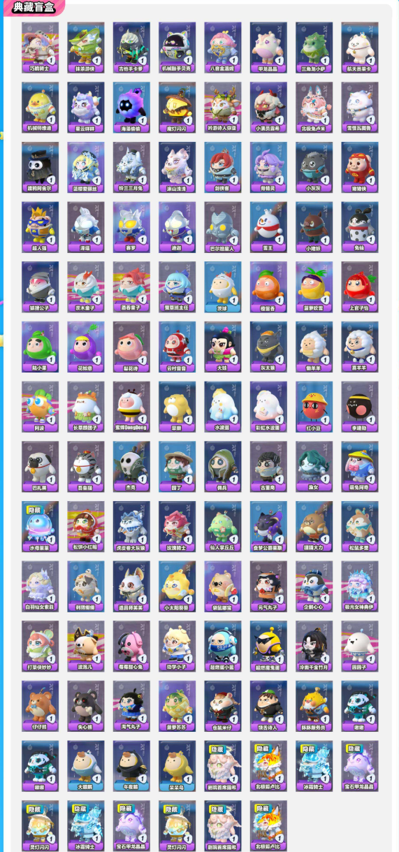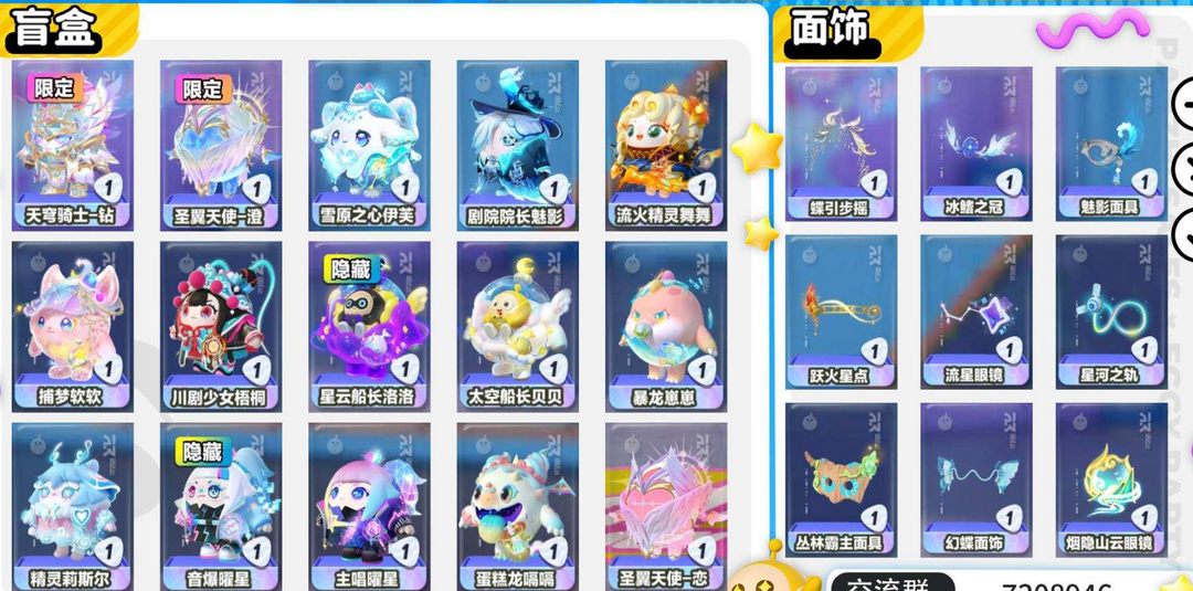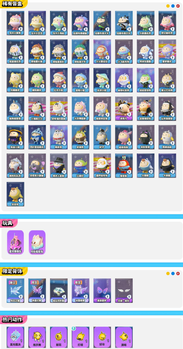 安卓官服;16W潮流值;22至臻角色盲盒;100典藏角色;9隐藏;月影摇摇兔(兔兔车);炫光舞台;星河弹弹车;至臻角色:限定天穹骑士-钻;限定圣翼天使-澄;音爆曜星;星云船长洛洛;圣翼天使-恋;剧院院长魅影;蛋糕龙嗝嗝;精灵莉斯尔;主唱曜星;暴龙崽崽;雪原之心伊芙;川剧少女梧桐;太空船长贝贝;蔷薇白皇后;流火精灵舞舞;捕梦软软;稀有盲盒角色:小羊;红小豆;水波蛋;圆圆子;奥特曼;萤火偷偷;灵灯闪闪;水母莱莱;冰霜骑士;宝石甲龙晶晶;歌院首席露希;北极狐卢比;限定翅膀:冰晶耀盾;裁决圣环;月白之隐;碎晶幻翼;等等各种