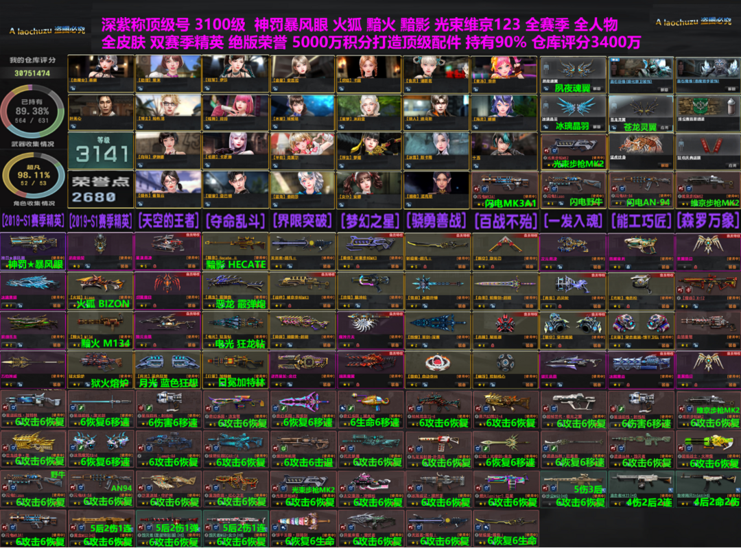 电信一区,深紫称。等级3200级,荣誉2700点,绝版荣誉,绝版皮肤,绝版称号。2018赛季精英2019赛季精英。绝版晶石巨像、晶石魔像、战旗、猛虎纹身、排位赛翡翠动态喷漆。神罚暴风眼、火狐、狱火熔炉、黯火、光束步枪123,维京步枪123、闪电MK3A1、闪电野牛、AN-94、特典狙-黯影、恶龙、月光。全赛季、全人物。持有90%,仓库评分3000万,绝版武器,极品强化。3000万积分打造顶级配件。满灾变插件