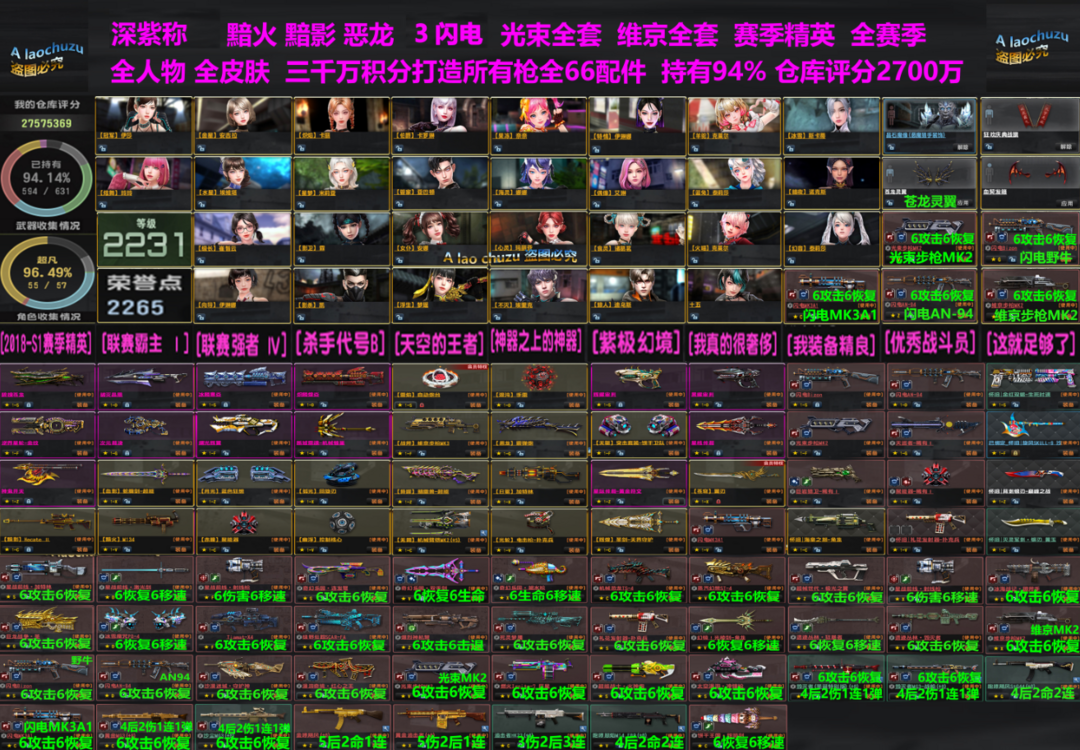 电二深紫称号,2200级。绝版荣誉,绝版皮肤,战旗、2018赛季精英。光束步枪123,维京步枪全套。闪电MK3A1、闪电野牛、闪电AN94、黯火、黯影、恶龙、特典狙-黯影、月光、弧光回旋刃、日冕加特林。全23个赛季、全部超凡人物。全部皮肤枪。持有94%,仓库评分2700万,绝版武器,极品强化。三千万积分打造顶级配件。 【已去黑雾,画面优化,画质清晰。【欢迎收藏】