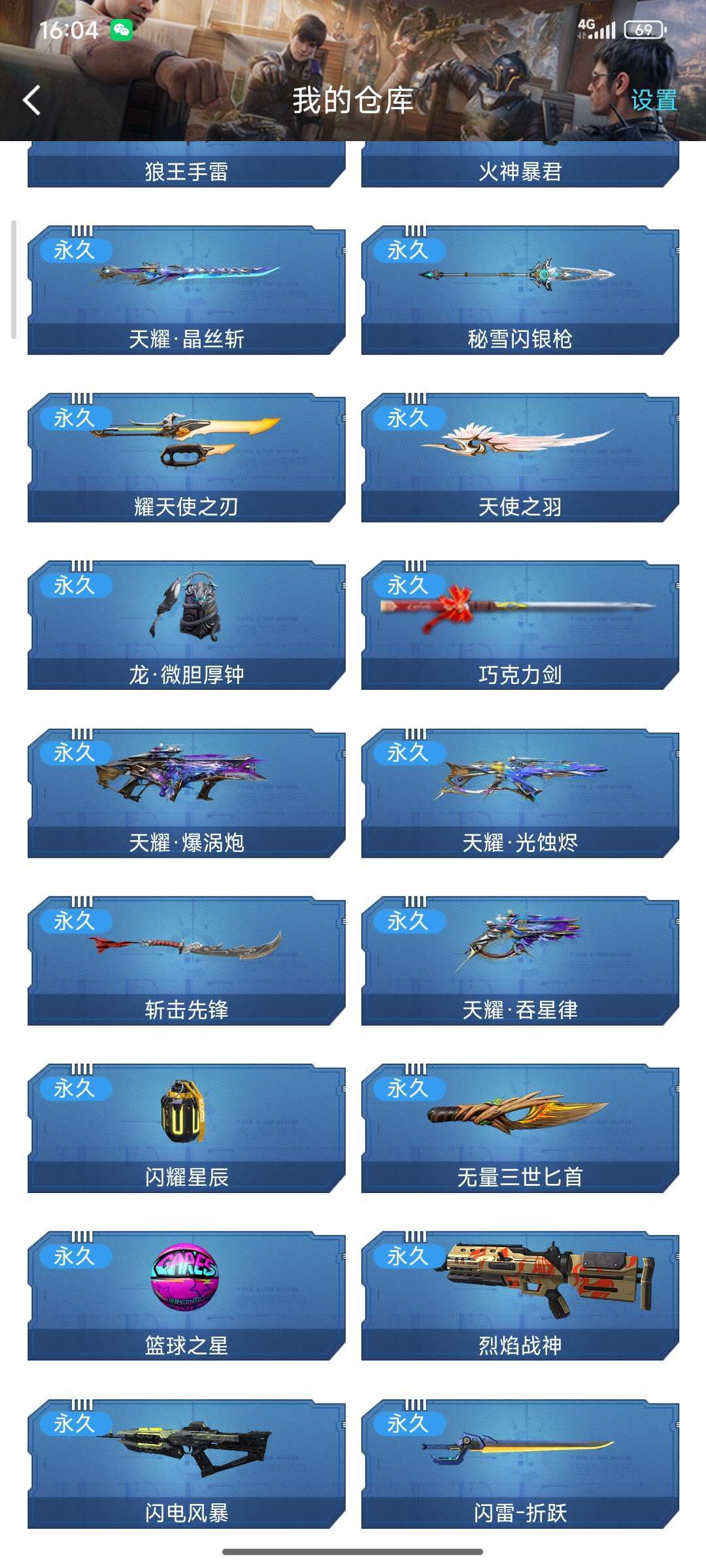 除天耀套装外,你账号里的装备还包含近战武器、枪械、投掷道具、装饰道具等类别,具体如下: 1. 近战武器:耀天使之刃、天使之羽、巧克力剑、斩击先锋、无量三世匕首、闪雷-折跃、秘雪闪银枪(长枪类近战) 2. 主副武器/枪械:火神暴君、天耀·爆涡炮、天耀·光蚀烬、天耀·吞星律、烈焰战神、闪电风暴 3. 投掷/装饰道具:狼王手雷、龙·微胆厚钟(装饰/道具类)、闪耀星辰(投掷类)、篮球之星(投掷类)
