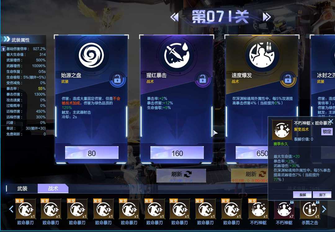 秘境71关(战术全部满沉淀),基础伤害倍率927.2,(光、风、冰)神武全45星,能量再生60
