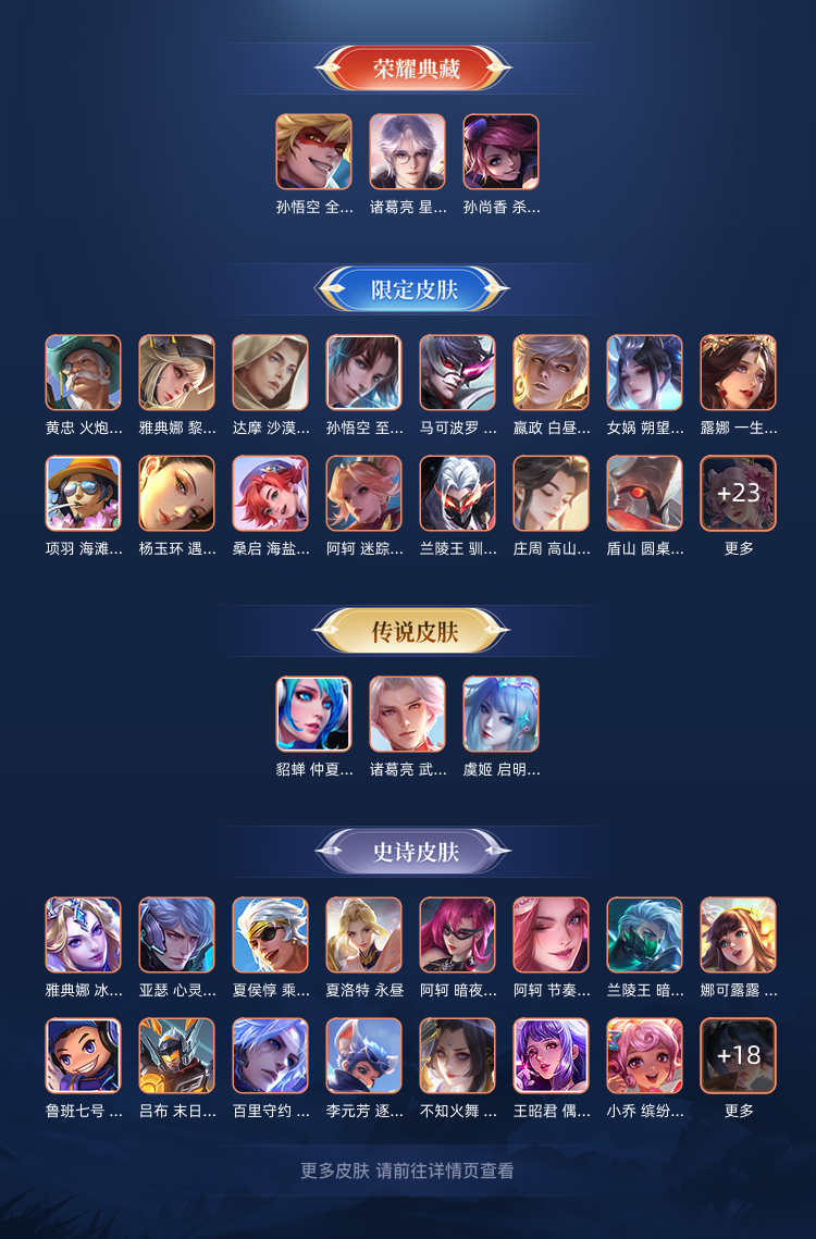 本游戏账号,英雄多,皮肤多。,铭文大概:21及以上,感受典藏皮肤带来的优质体验快感,尽情享受FMVP皮肤带来的主角光环 私人所属英雄皮肤有:孙尚香 杀手不太冷||孙悟空 全息碎影貂蝉 仲夏夜之梦干将莫邪 久胜战神孙悟空 至尊宝||嬴政 白昼王子||露娜 一生所爱||马可波罗 暗影游猎||女娲 朔望之晖||黄忠 火炮绅士||雅典娜 黎明之约||达摩 沙漠行僧,等等