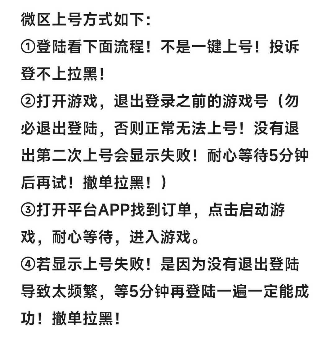 ✅不禁言!平台显示错误!游戏内无禁言! ✅微区登陆之前必须把之前登陆过的号退出,必须是退出状态!不然登陆不了!⛔ ✅第一步若是没退出登陆再次上号会显示上号失败【勿必退出登陆】等5分钟再次上号或者重启手机即可!撤单拉黑!❎ 2.每次都要从订单界面重新上号 租客注意:违者改密顶号申诉 ❶ 禁止游戏内挂机逃跑、辱骂、等所有扣分行为! ❷ 禁止利用账号诈骗送皮肤等非法牟利行为! ❸ 禁止恶意毁号 退战队 重置游戏二级密码! ❹ 所有账号为一单一密码 不存在顶号 如密码泄露投诉顶号者一律拉黑! ❺ 平台严厉打击使用游戏外挂皮肤美化包等非法游戏工具如有发现我们将会上报平台内部技术部门封杀所有账户IP以及关联账号!