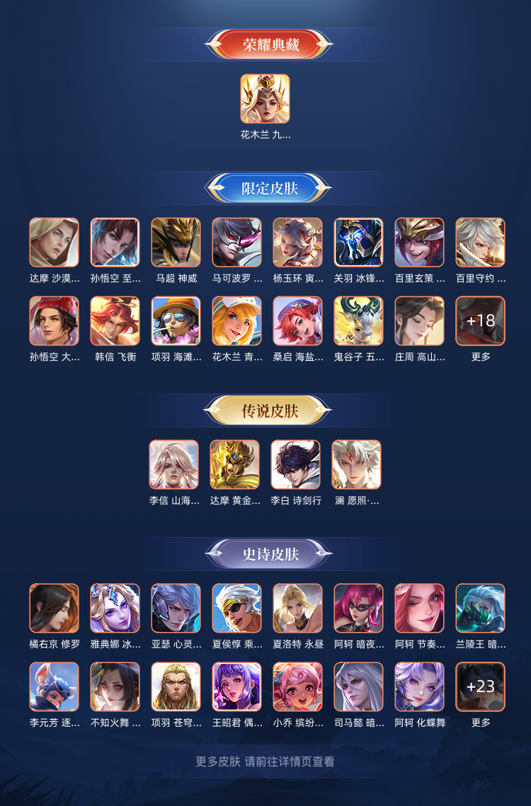 本游戏账号,英雄多,皮肤多。 私人所属英雄皮肤有百里守约 朱雀志,百里玄策 白虎志,关羽 冰锋战神,韩信 飞衡 群星魔术团,马可波罗 怪盗基德,孙悟空 大圣娶亲 至尊宝,杨玉环 寅虎·心曲,马超 神威,李白 诗剑行,李信兔年限定,木兰 水晶猎龙者,玫瑰行动,青春决赛季,橘右京 修罗,夏洛特 永昼,等等