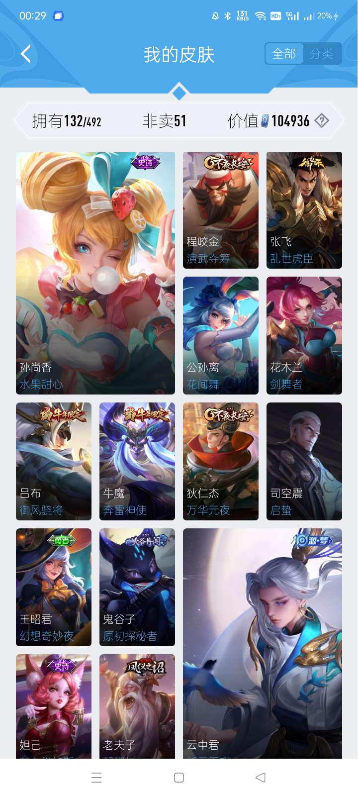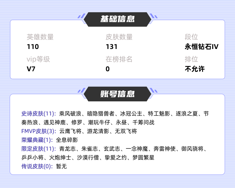 喜欢本账号请点 ☆收藏☆ 方便下次租用,谢谢光临惠顾 本游戏账号英雄多皮肤多。感受典藏皮肤带来的优质体验快感尽情享受FMVP皮肤带来的主角光环 私人所属英雄皮肤有:孙悟空 全息碎影曜 云鹰飞将马超 无双飞将西施 游龙清影百里守约 朱雀志达摩 沙漠行僧黄忠 火炮绅士铠 青龙志鲁班七号 乒乒小将吕布 御风骁将牛魔 奔雷神使苏烈 玄武志孙策 挚爱之约李信 一念神魔等等 注意事项: A.游戏过程中请不要恶意挂机或者不文明发言B.恶意挂机、顶号等行为将被拉黑无法再次下单C.进入游戏后中途请勿退出登陆,否则无法再次上号D.部分账号由于异地登录可能会出现密码错误提示,通常再尝试5-6次后可上号 喜欢本账号请点 ☆收藏☆ 方便下次租用,谢谢光临惠顾