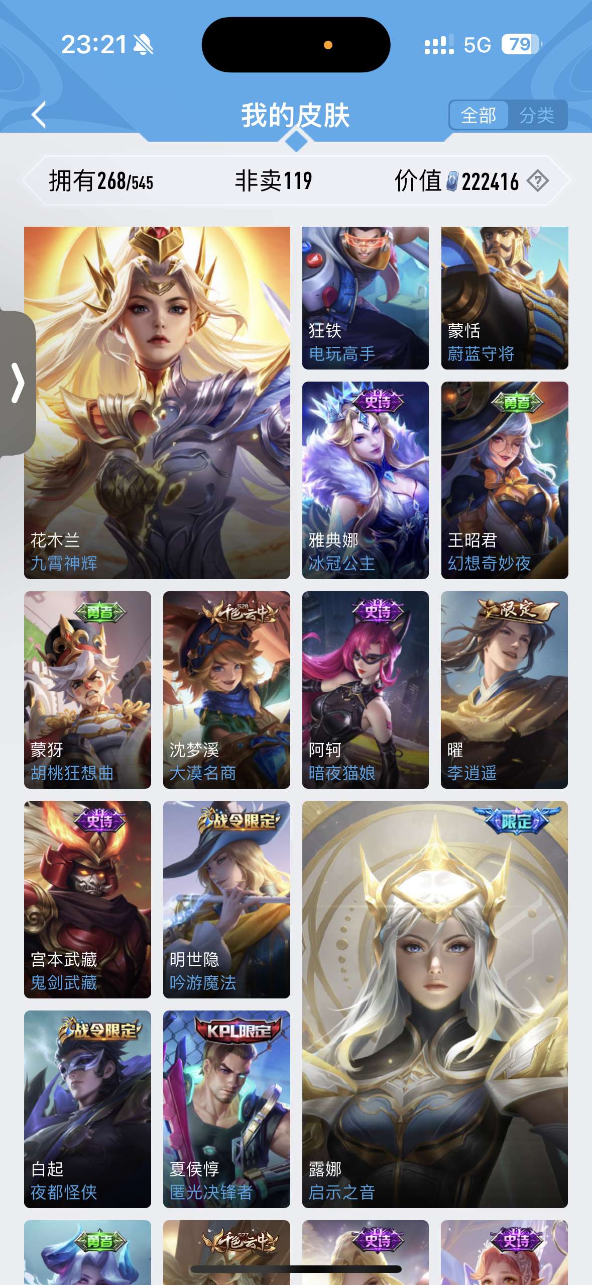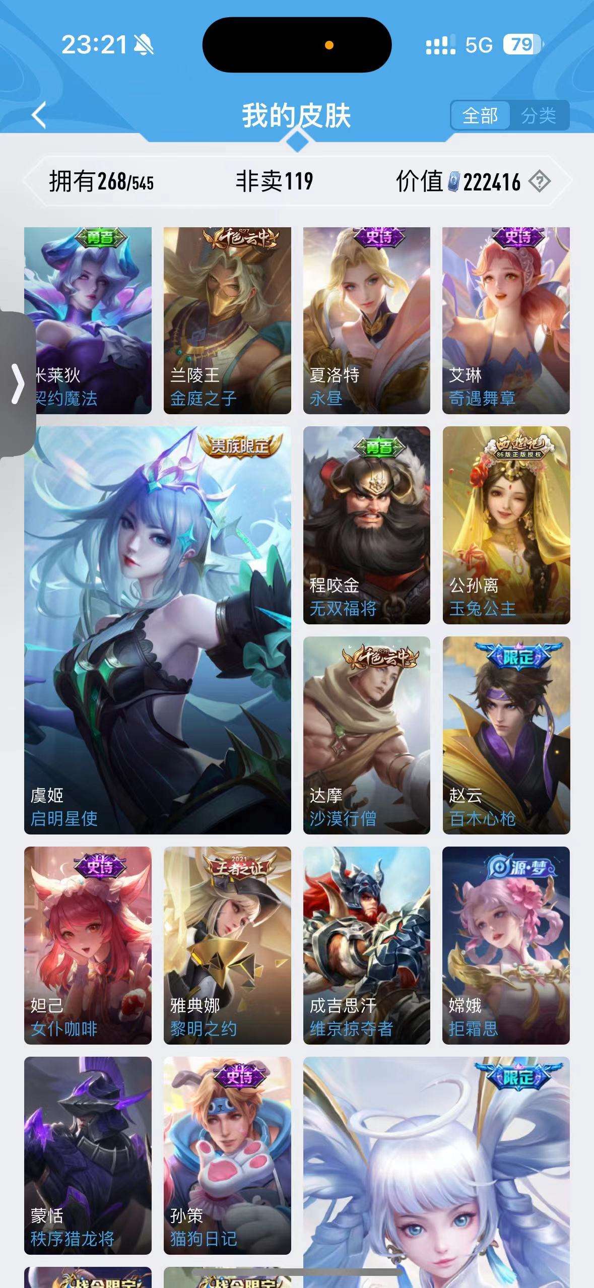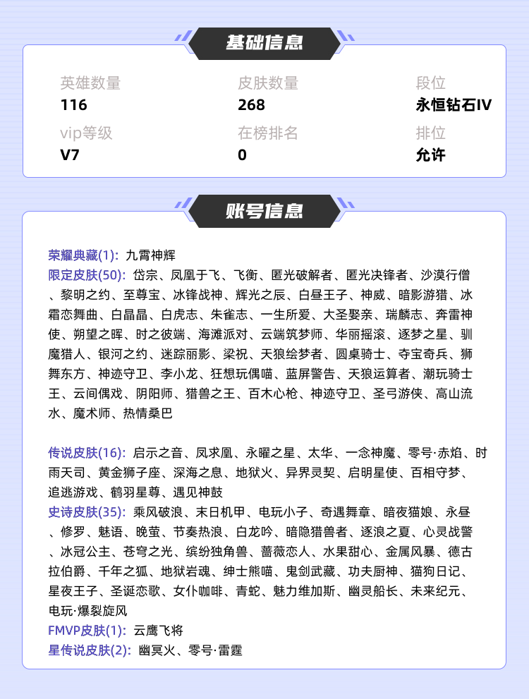 本游戏账号: ,英雄多,皮肤多。典藏皮肤1个,感受典藏皮肤带来的优质体验快感,FMVP皮肤1个,尽情享受FMVP皮肤带来的主角光环, 私人所属英雄皮肤有:花木兰 九霄神辉孙悟空 地狱火||达摩 黄金狮子座||马可波罗 深海之息曜 云鹰飞将亚瑟 潮玩骑士王||亚瑟 追逃游戏||伽罗 太华||关羽 冰锋战神||典韦 岱宗||典韦 蓝屏警告||后羿 辉光之辰||墨子 神迹守卫||夏侯惇 匿光决锋者||女娲 朔望之晖||妲己 时之彼端||妲己 热情桑巴||嬴政 白昼王子||孙悟空 大圣娶亲||孙悟空 至尊宝||孙悟空 零号·赤焰||干将莫邪 冰霜恋舞曲||扁鹊 奇幻香踪||李信 一念神魔||李白 凤求凰||杨戬 永曜之星||杨戬 潮玩骑兵||沈梦溪 匿光破解者||牛魔 奔雷神使||狄仁杰 魔术师||王昭君 凤凰于飞||甄姬 至美·化雀舞||百里守约 朱雀志||百里玄策 白虎志||芈月 白晶晶||花木兰 瑞麟志||诸葛亮 时雨天司||诸葛亮 鹤羽星尊||赵云 百木心枪||达摩 沙漠行僧||