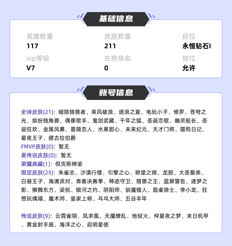 本游戏账号: ,英雄多,皮肤多。典藏皮肤1个,感受典藏皮肤带来的优质体验快感, 私人所属英雄皮肤有:武则天 倪克斯神谕后羿 黄金射手座||吕布 天魔缭乱||孙尚香 末日机甲||孙悟空 地狱火||李白 凤求凰||武则天 海洋之心||虞姬 云霓雀翎||虞姬 启明星使||貂蝉 仲夏夜之梦,等等