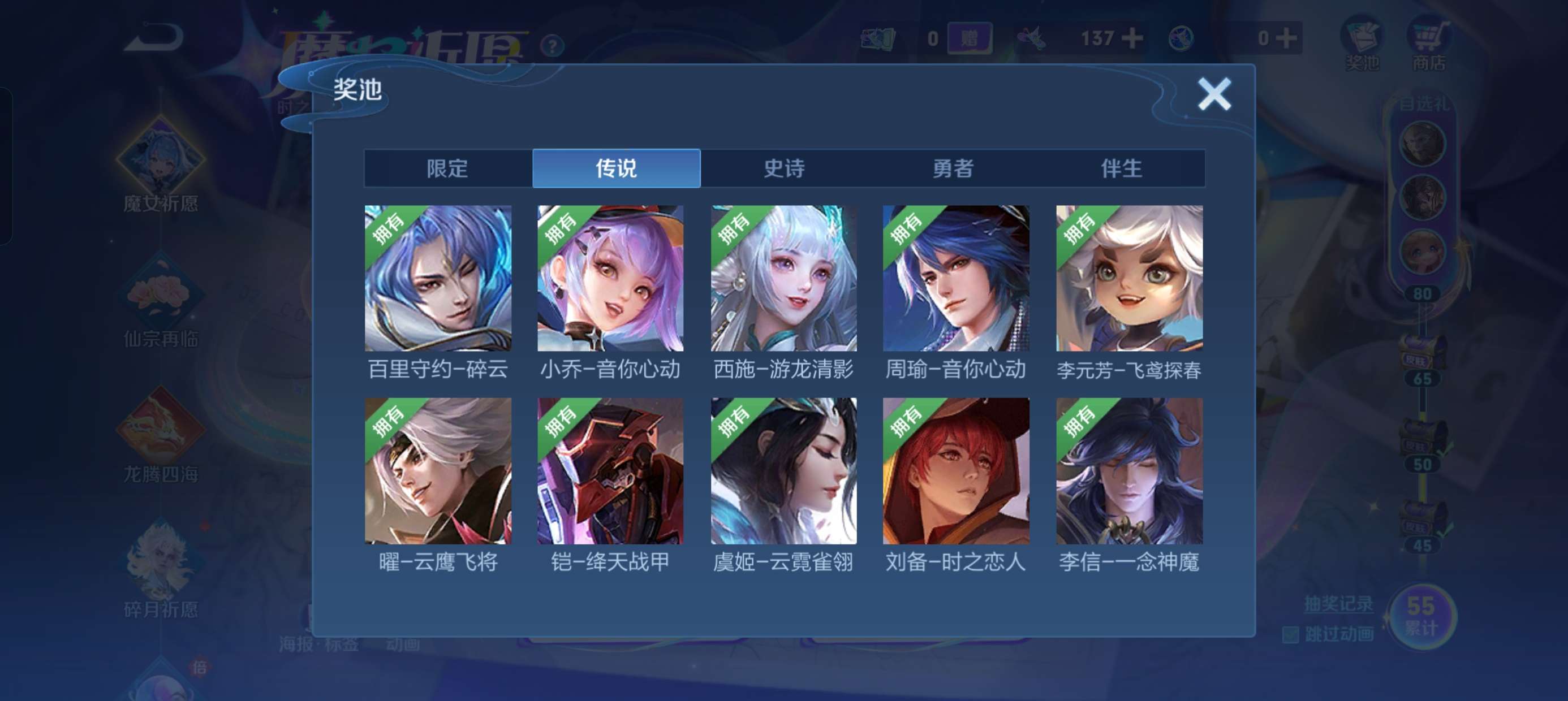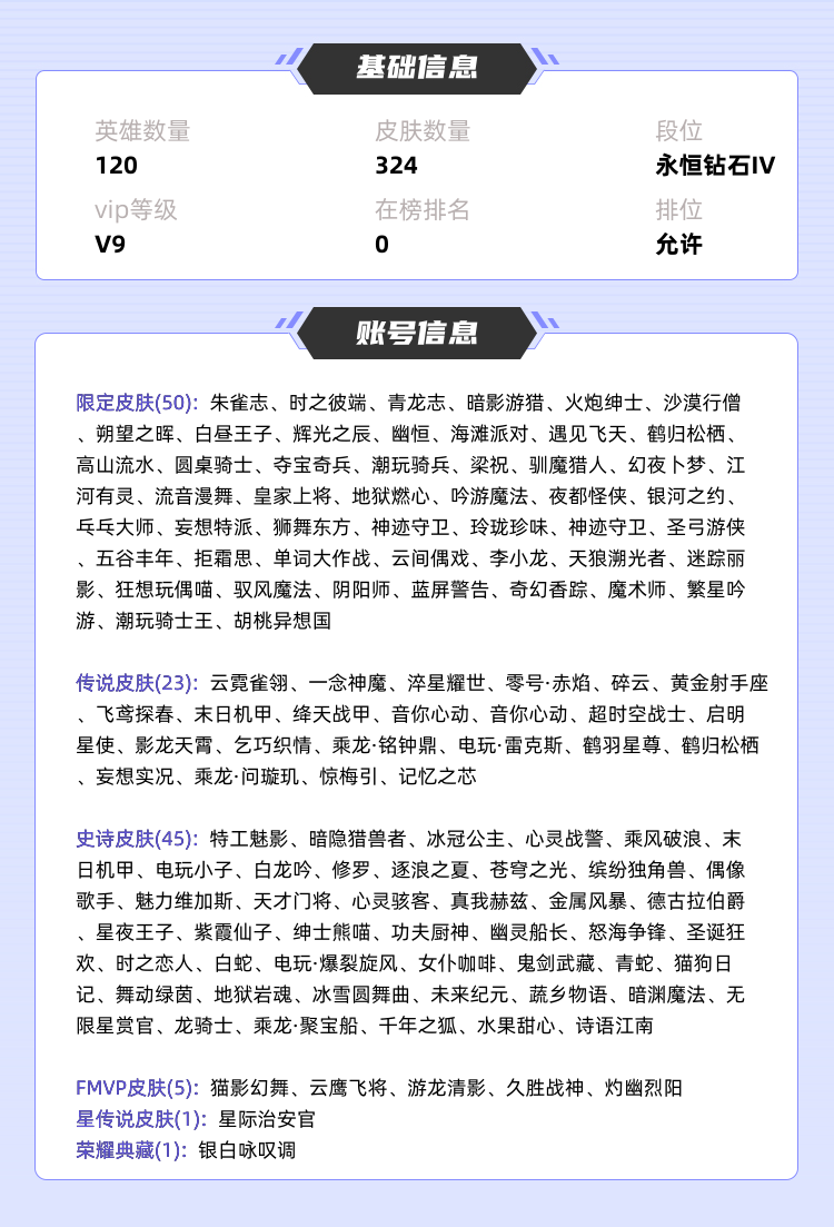 本游戏账号: ,英雄多,皮肤多。典藏皮肤1个,感受典藏皮肤带来的优质体验快感,FMVP皮肤5个,尽情享受FMVP皮肤带来的主角光环, 私人所属英雄皮肤有:铠 银白咏叹调百里守约 碎云||周瑜 音你心动||孙尚香 乘龙·问璇玑||李信 一念神魔||诸葛亮 鹤羽星尊||孙悟空 零号·赤焰||李元芳 飞鸢探春||狄仁杰 超时空战士||王昭君 乞巧织情||后羿 黄金射手座||虞姬 云霓雀翎||虞姬 启明星使||澜 电玩·雷克斯||孙策 末日机甲||赵云 淬星耀世||赵云 乘龙·铭钟鼎||小乔 音你心动||铠 绛天战甲||云缨 鹤归松栖||公孙离 记忆之芯||兰陵王 影龙天霄||马可波罗 妄想实况||宫本武藏 惊梅引,等等