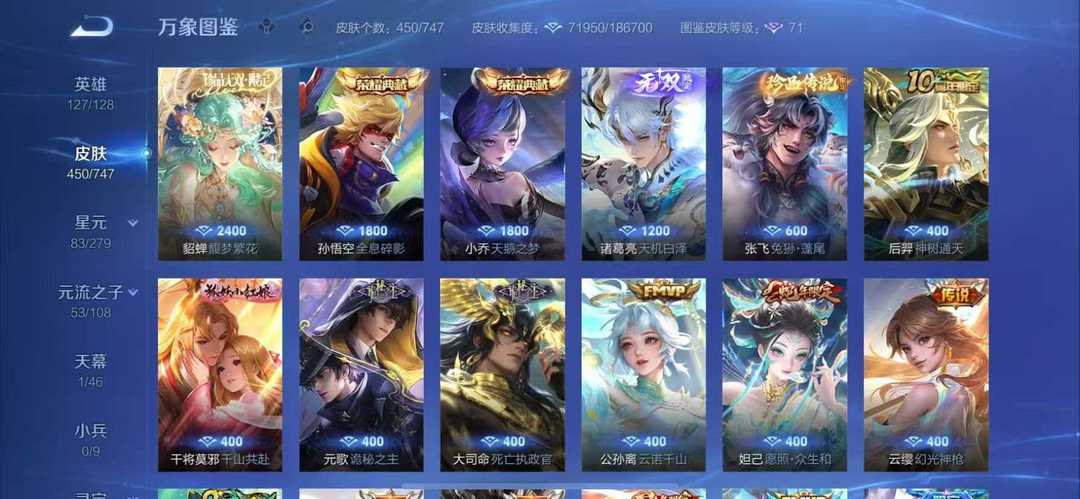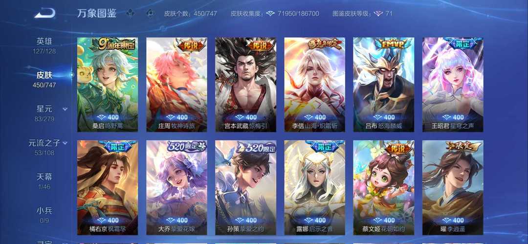 本游戏账号: V10用户,基础段位:至尊星耀V,英雄多,皮肤多。典藏皮肤8个,感受典藏皮肤带来的优质体验快感,FMVP皮肤8个,尽情享受FMVP皮肤带来的主角光环, 私人所属英雄皮肤有:诸葛亮 星域神启||孙尚香 杀手不太冷||鲁班七号 星空梦想||夏侯惇 无限飓风号||李白 鸣剑·曳影||武则天 倪克斯神谕||花木兰 九霄神辉||小乔 天鹅之梦诸葛亮 时雨天司||诸葛亮 武陵仙君||大乔 挚爱花嫁||铠 绛天战甲||百里守约 碎云||梦奇 胖达荣荣||孙尚香 异界灵契||孙尚香 末日机甲||孙尚香 音你闪耀||公孙离 记忆之芯||公孙离 祈雪灵祝||鲁班七号 寅虎·瑞焰||孙策 末日机甲||孙策 挚爱之约||上官婉儿 神器·万象笔||吕布 天魔缭乱||周瑜 音你心动||曜 山海·苍雷引||宫本武藏 地狱之眼||李白 诗剑行||李白 凤求凰||马可波罗 深海之息||狄仁杰 神器·狴犴令||狄仁杰 超时空战士||达摩 黄金狮子座||项羽 无限倾心||武则天 海洋之心||夏洛特 浮生