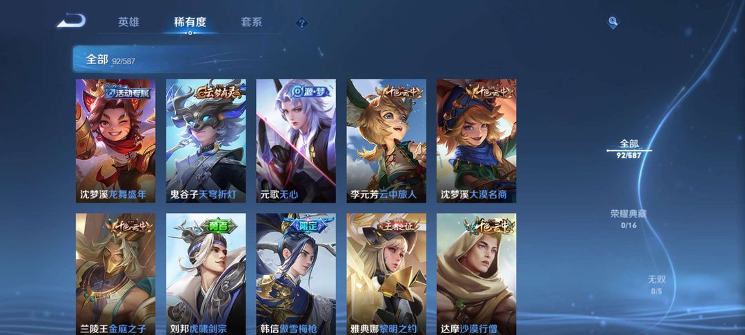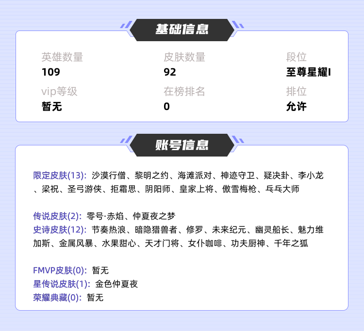 本游戏账号: ,英雄多,皮肤多。 私人所属英雄皮肤有:貂蝉 仲夏夜之梦||孙悟空 零号·赤焰嫦娥 拒霜思||上官婉儿 梁祝||雅典娜 黎明之约||墨子 神迹守卫||赵云 皇家上将||韩信 傲雪梅枪||达摩 沙漠行僧||项羽 海滩派对||狄仁杰 阴阳师||后羿 圣弓游侠||裴擒虎 李小龙||明世隐 疑决卦||鲁班大师 乓乓大师,等等