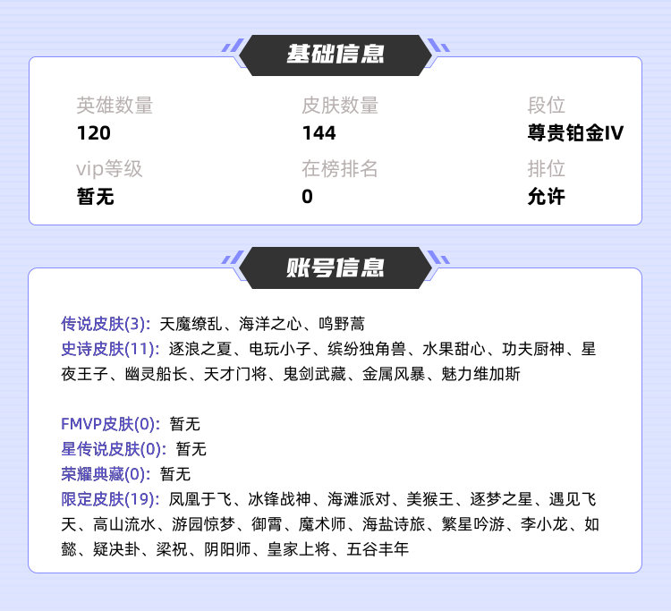 本游戏账号: ,英雄多,皮肤多。 私人所属英雄皮肤有:武则天 海洋之心||吕布 天魔缭乱关羽 冰锋战神||杨玉环 遇见飞天||上官婉儿 梁祝||孙悟空 美猴王||鬼谷子 五谷丰年||安琪拉 如懿||明世隐 疑决卦||桑启 海盐诗旅||庄周 高山流水||狄仁杰 魔术师||狄仁杰 阴阳师||王昭君 凤凰于飞||米莱狄 御霄||项羽 海滩派对||蔡文姬 繁星吟游||赵云 皇家上将||甄姬 游园惊梦||裴擒虎 李小龙||马可波罗 逐梦之星,等等