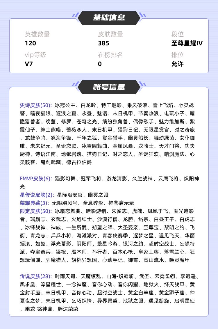 本游戏账号: ,英雄多,皮肤多。典藏皮肤3个,感受典藏皮肤带来的优质体验快感,FMVP皮肤6个,尽情享受FMVP皮肤带来的主角光环, 私人所属英雄皮肤有:孙悟空 全息碎影||虞姬 神鉴启示录||夏侯惇 无限飓风号达摩 黄金狮子座||周瑜 音你心动||梦奇 胖达荣荣||孙尚香 音你闪耀||孙尚香 末日机甲||孙尚香 异界灵契||关羽 武圣||李信 一念神魔||李信 山海·炽霜斩||李白 凤求凰||诸葛亮 时雨天司||孙悟空 地狱火||狄仁杰 超时空战士||王昭君 乞巧织情||后羿 黄金射手座||虞姬 云霓雀翎||虞姬 启明星使||貂蝉 仲夏夜之梦||貂蝉 遇见胡旋||张良 黄金白羊座||孙策 末日机甲||赵云 淬星耀世||赵云 乘龙·铭钟鼎||曜 李逍遥||小乔 音你心动||铠 绛天战甲||吕布 天魔缭乱||宫本武藏 地狱之眼,等等