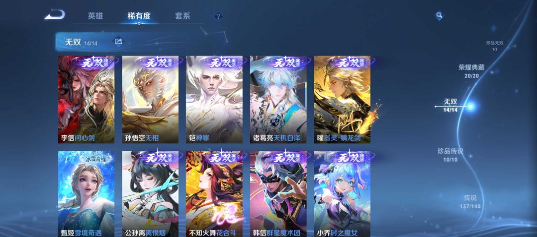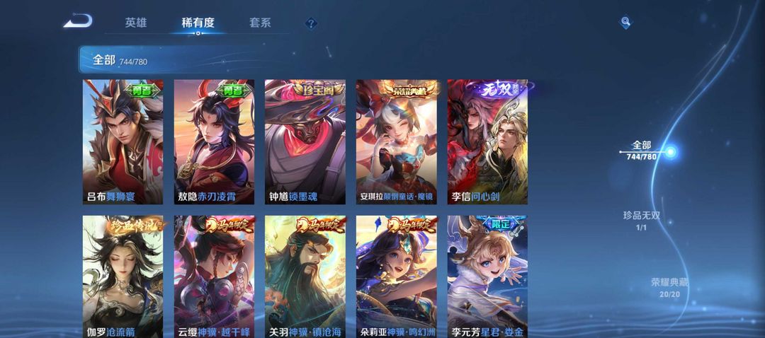 本游戏账号:V10无双贵族用户,英雄多,皮肤多。典藏皮肤22个,感受典藏皮肤带来的优质体验快感,新皮全有,FMVP皮肤9个,尽情享受
