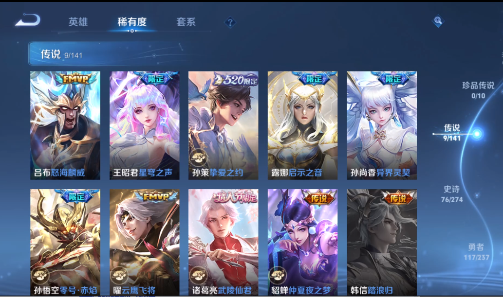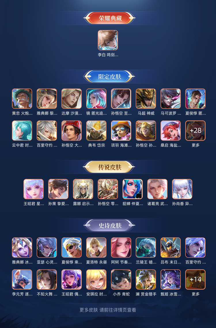 英雄:孙悟空(孙悟空 孙行者,孙悟空 零号·赤焰,孙悟空 大圣娶亲,孙悟空 至尊宝,孙悟空 西部大镖客,区标);诸葛亮(诸葛亮 武陵仙君,诸葛亮 掌控之力,区标);孙尚香(孙尚香 沉稳之力,孙尚香 异界灵契,孙尚香 水果甜心,区标);马可波罗(马可波罗 潮玩牛仔,马可波罗 暗影游猎,区标);李白(李白 范海辛,李白 鸣剑·曳影,区标);吕布(吕布 野性能量,吕布 圣诞狂欢,吕布 末日机甲,吕布 怒海麟威);马超(马超 神威);澜(澜 赏金猎手);曜(曜 云鹰飞将,曜 归虚梦演);典韦(典韦 岱宗,典韦 蓝屏警告,典韦 铁甲之心,典韦 黄金武士);公孙离(公孙离 玉兔公主,公孙离 花间舞);孙策(孙策 挚爱之约,孙策 海之征途);露娜(露娜 启示之音,露娜 瓷语鉴心,露娜 哥特玫瑰);干将莫邪(干将莫邪 第七人偶,干将莫邪 胡桃夹子,干将莫邪 真爱魔法);貂蝉(貂蝉 仲夏夜之梦,貂蝉 圣诞恋歌,貂蝉 异域舞娘);韩信(韩信 街头霸王,韩信 傲雪梅枪,韩信 教廷特使);铠(铠 曙光守护者,铠 龙域领主);妲己(妲己 魅力维加斯,妲己 热情桑巴,妲己 女仆咖啡,妲己 紫罗兰之誓,妲己 少女阿
