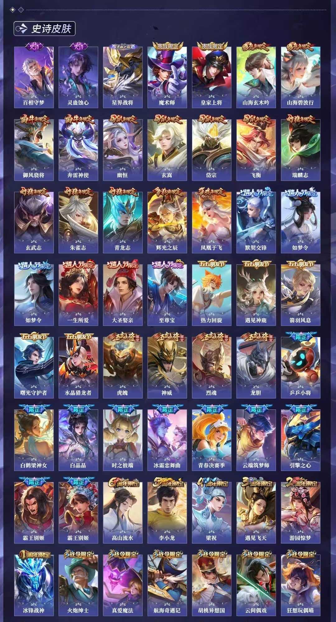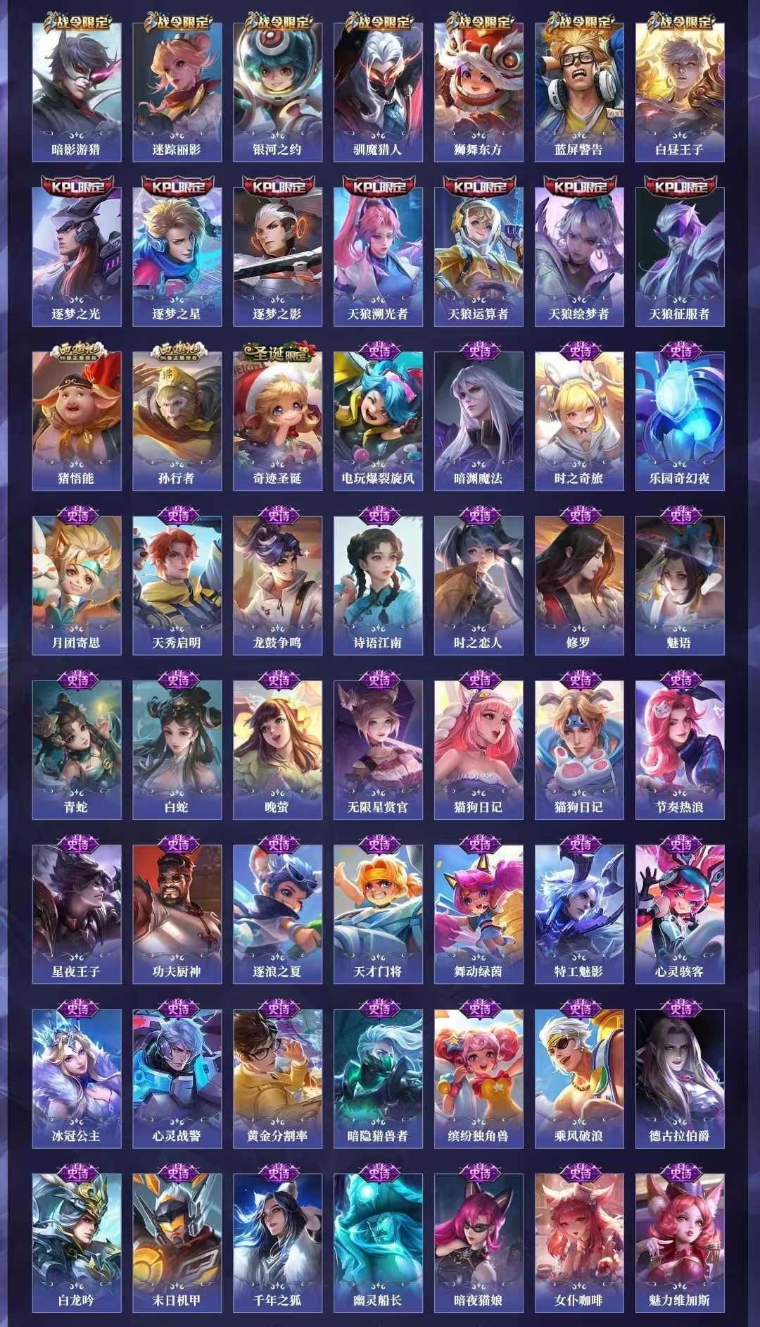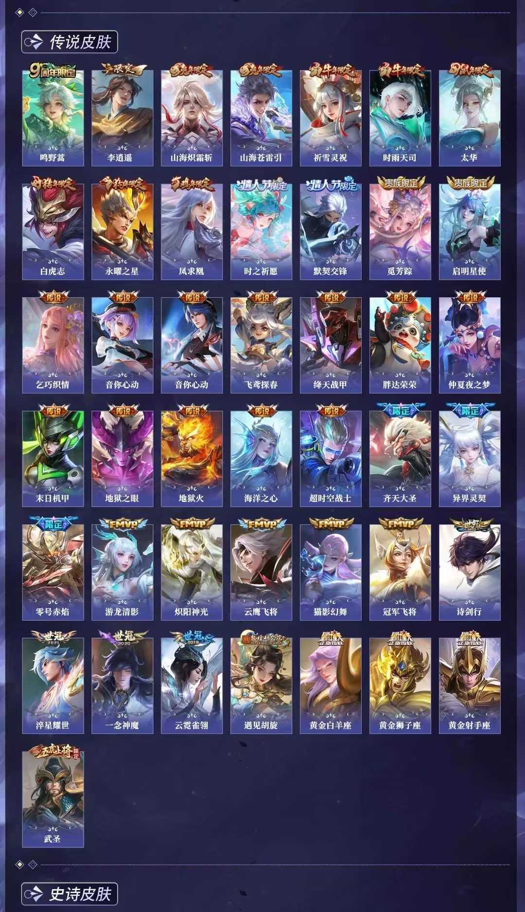 【C62】贵族V10~401皮肤41传说情瑶7水晶3星元全息碎影,炽霜斩,鸣剑曳影,无限飓风号,星空梦想,天鹅之梦,杀手不太冷【全牛年,全五虎上将,全五岳,全五兽】