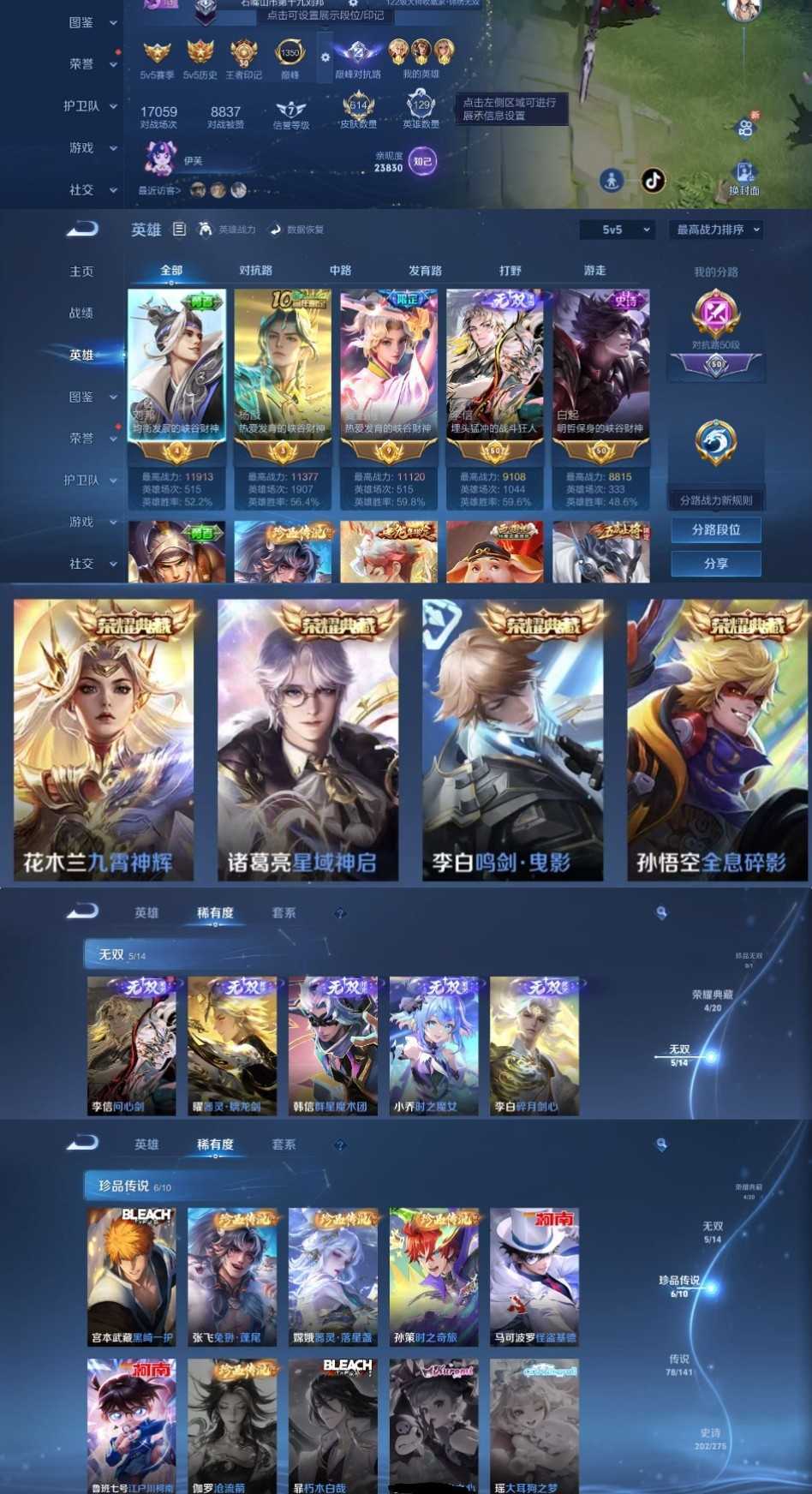 时间到了还登录白玩或者顶号全部改密拉黑处理永不解除,顶号机器会秒禁玩改密,顶号不仅拉黑还没得玩,赚三两块不容易,请理解谢谢。 ❤❤❤❤❤❤❤❤❤❤❤❤❤❤❤❤❤❤❤ 请勿开挂,挂机,送头,骂人,撤单后游戏等如有违规永久拉黑永不解除。 重置二级密码不要费劲了,号主每天都会上号查看,多行不义必自毙,人在做天在看,多做好事多自律,少做缺德事。 该号英雄129个皮肤614个,典藏5个,无双5个,珍品传说6个,星传说9个,传说78个,史诗202个,祝您游戏愉快~