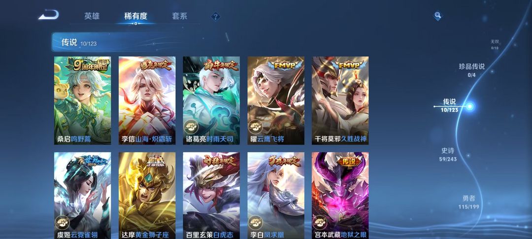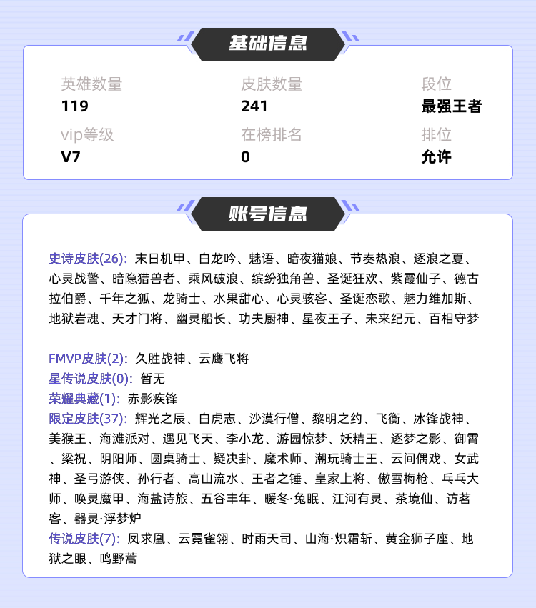 本游戏账号: V7用户,基础段位:最强王者,英雄多,皮肤多。典藏皮肤1个,感受典藏皮肤带来的优质体验快感,FMVP皮肤2个,尽情享受FMVP皮肤带来的主角光环, 私人所属英雄皮肤有:关羽 赤影疾锋桑启 鸣野蒿||李信 山海·炽霜斩||虞姬 云霓雀翎||宫本武藏 地狱之眼||诸葛亮 时雨天司||达摩 黄金狮子座||李白 凤求凰干将莫邪 久胜战神||曜 云鹰飞将,等等