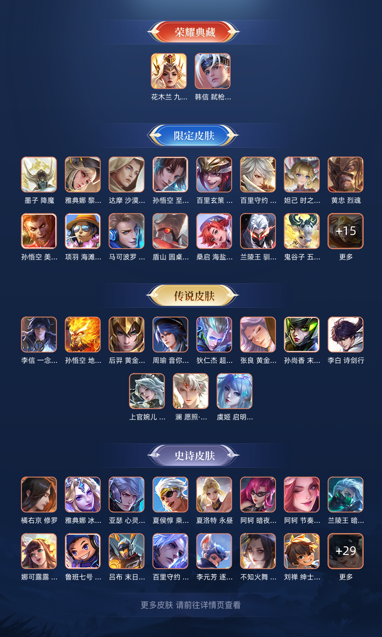 本游戏账号: ,英雄多,皮肤多。典藏皮肤2个,感受典藏皮肤带来的优质体验快感,FMVP皮肤4个,尽情享受FMVP皮肤带来的主角光环, 私人所属英雄皮肤有:韩信 弑枪猎影||花木兰 九霄神辉云缨 幻光神枪||马可波罗 怪盗基德||周瑜 音你心动||李信 一念神魔||孙尚香 末日机甲||李白 诗剑行||诸葛亮 鹤羽星尊||上官婉儿 神器·万象笔||孙悟空 齐天大圣||孙悟空 地狱火||安琪拉 酷洛米之心||庄周 牧神诗旅||桑启 鸣野蒿||狄仁杰 超时空战士||王昭君 映山客||后羿 黄金射手座||虞姬 启明星使||张飞 兔狲·蓬尾||瑶 大耳狗之梦||澜 愿照·九州拓||张良 黄金白羊座,等等