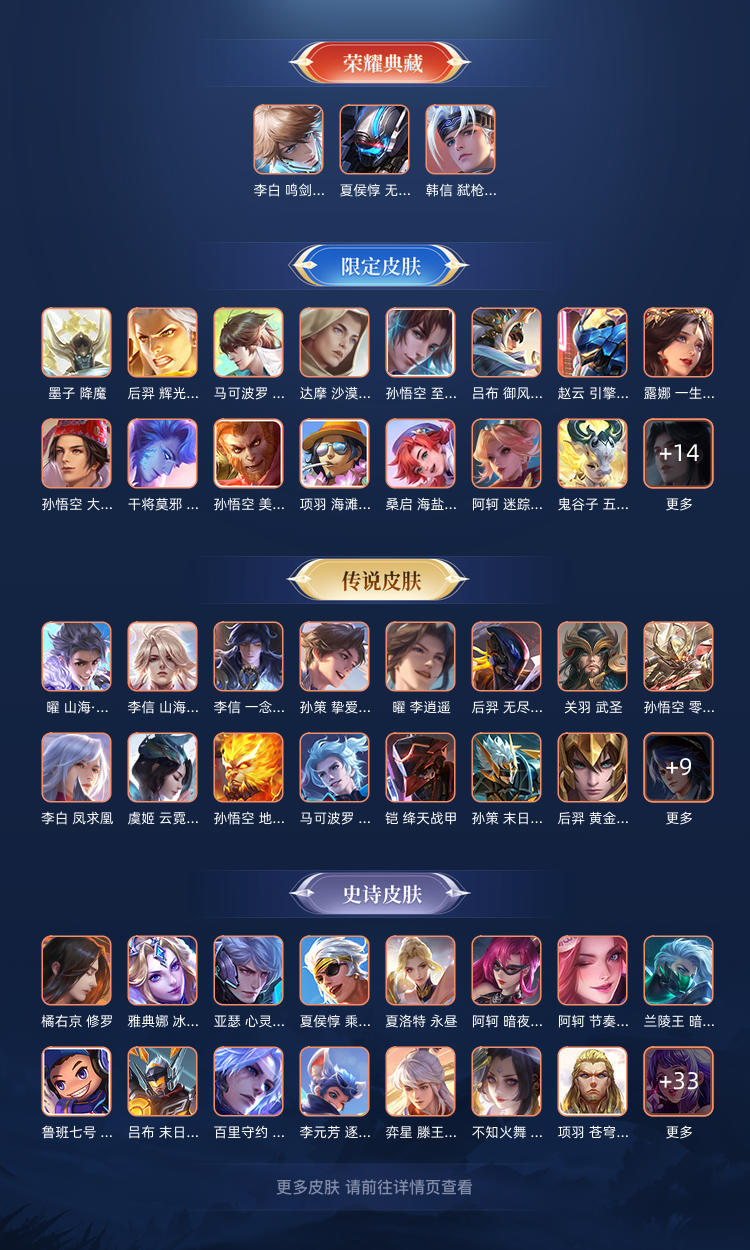 本游戏账号: ,英雄多,皮肤多。典藏皮肤四个,感受典藏皮肤带来的优质体验快感,FMVP皮肤4个,尽情享受FMVP皮肤带来的主角光环, 私人所属英雄皮肤有:李白 鸣剑·曳影||韩信 弑枪猎影||夏侯惇 无限飓风号兰陵王 影龙天霄||马可波罗 深海之息||宫本武藏 惊梅引||百里守约 碎云||达摩 黄金狮子座||周瑜 音你心动||李信 一念神魔||李信 山海·炽霜斩||孙尚香 乘龙·问璇玑||关羽 武圣||李白 凤求凰||李白 诗剑行||诸葛亮 鹤羽星尊||孙悟空 零号·赤焰||孙悟空 齐天大圣||孙悟空 地狱火||桑启 鸣野蒿||嫦娥 器灵·落星盏||狄仁杰 超时空战士||王昭君 乞巧织情||后羿 无尽星芒||夏洛特 浮生妄||虞姬 云霓雀翎||虞姬 愿照·岁时盈||虞姬 启明星使||张飞 百相守梦||孙策 挚爱之约||孙策 末日机甲||孙策 乘龙·淬吴钩||赵云 乘龙·铭钟鼎||干将莫邪 画中仙||曜 李逍遥||曜 山海·苍雷引||橘右京 枫霜尽||马超 琥珀纪元||铠 绛天战甲