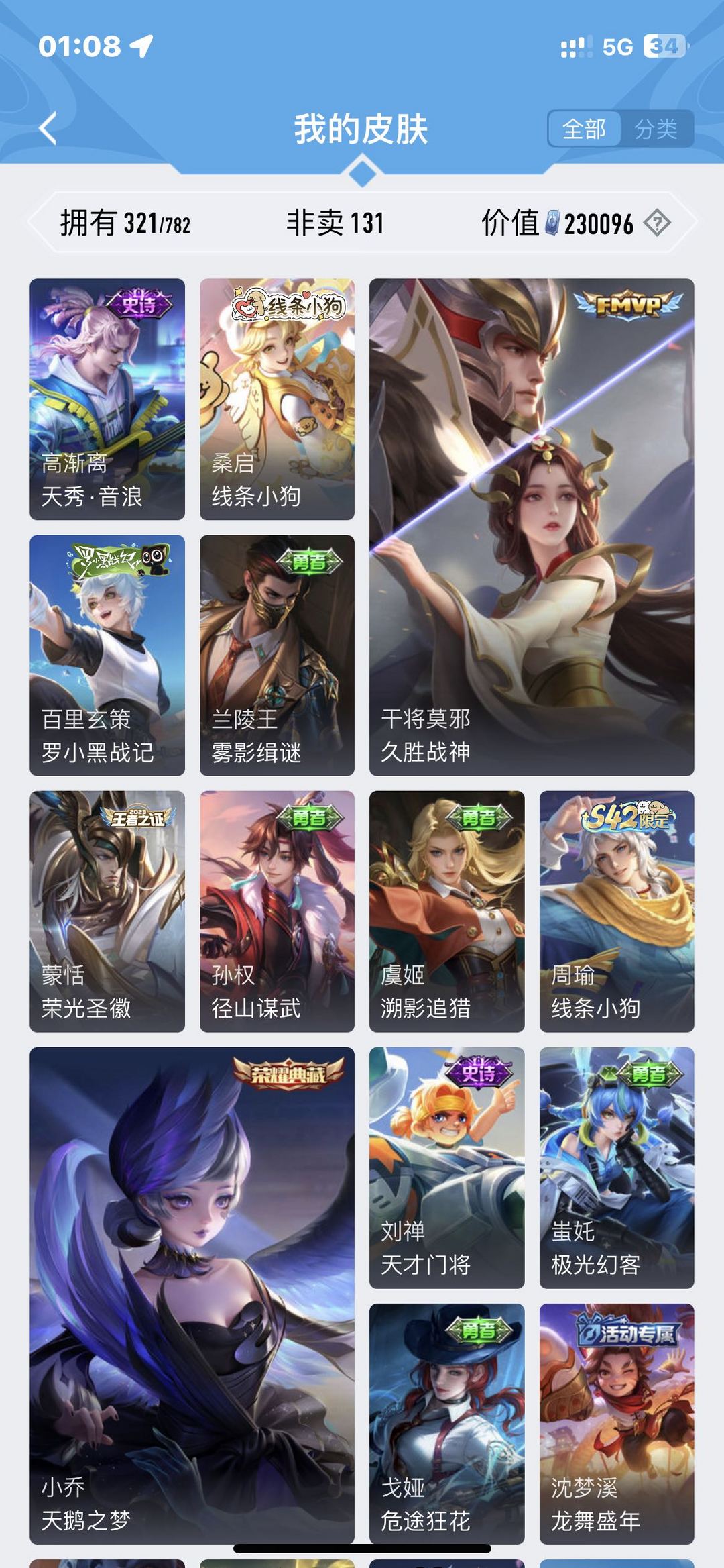 苹果Q区 V8,128英雄 321皮肤 2个典藏