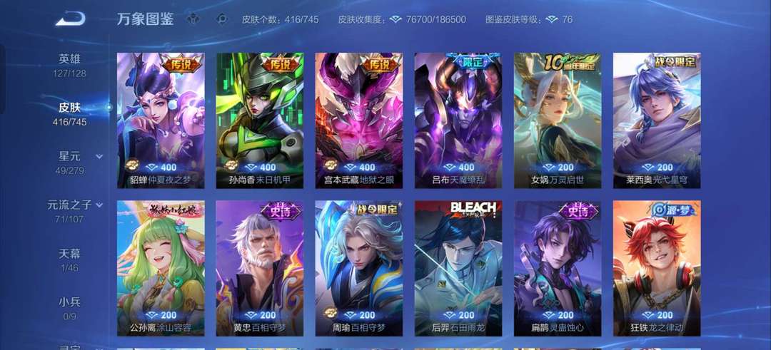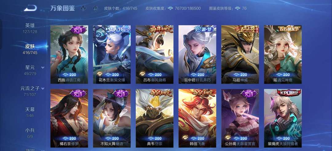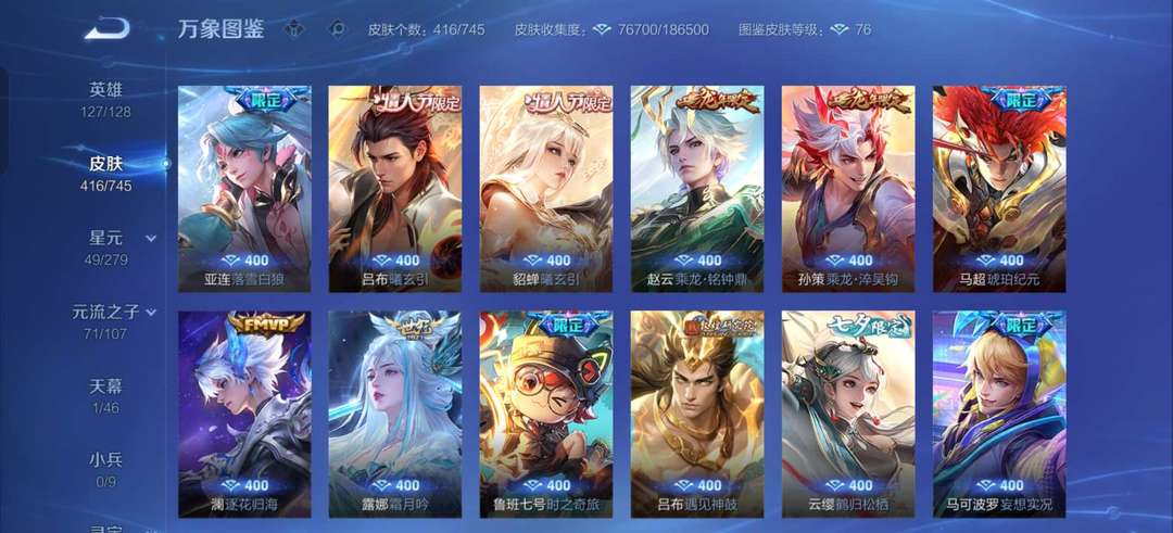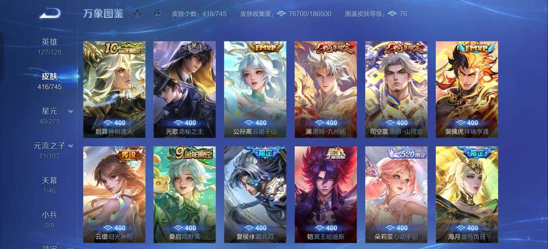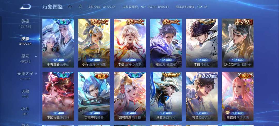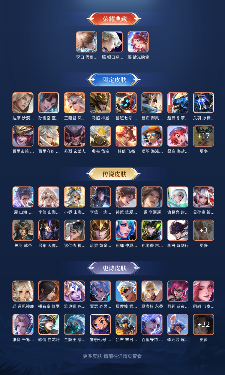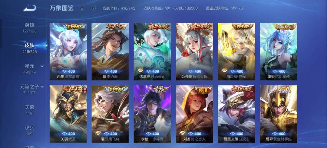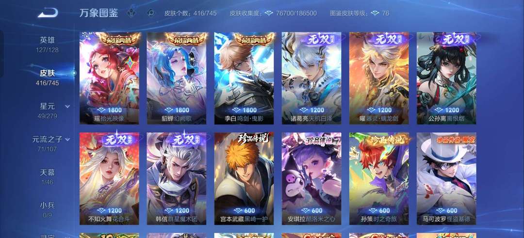 v9 416皮✨ 3典藏 5无双 4珍品传说各种精品皮肤等你来玩