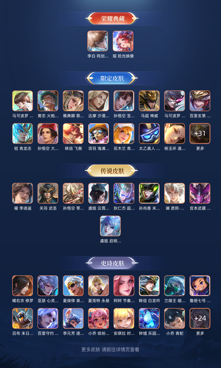 俩典藏,李白和瑶的,几十款传说和限定,还有大量史诗精皮可以排位