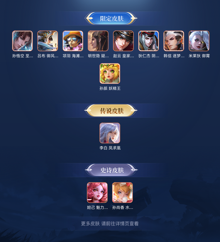 伽罗(伽罗 花见巫女);李白(李白 凤求凰);韩信(韩信 教廷特使,韩信 逐梦之影);阿轲;吕布(吕布 御风骁将);孙悟空(孙悟空 至尊宝);诸葛亮(诸葛亮 星航指挥官);虞姬(虞姬 加勒比小姐,虞姬 凯尔特女王);马可波罗(马可波罗 激情绿茵);等皮肤
