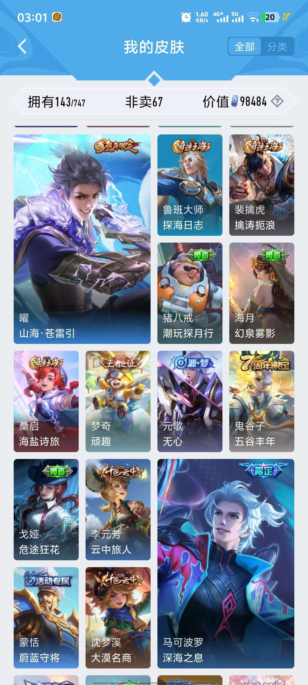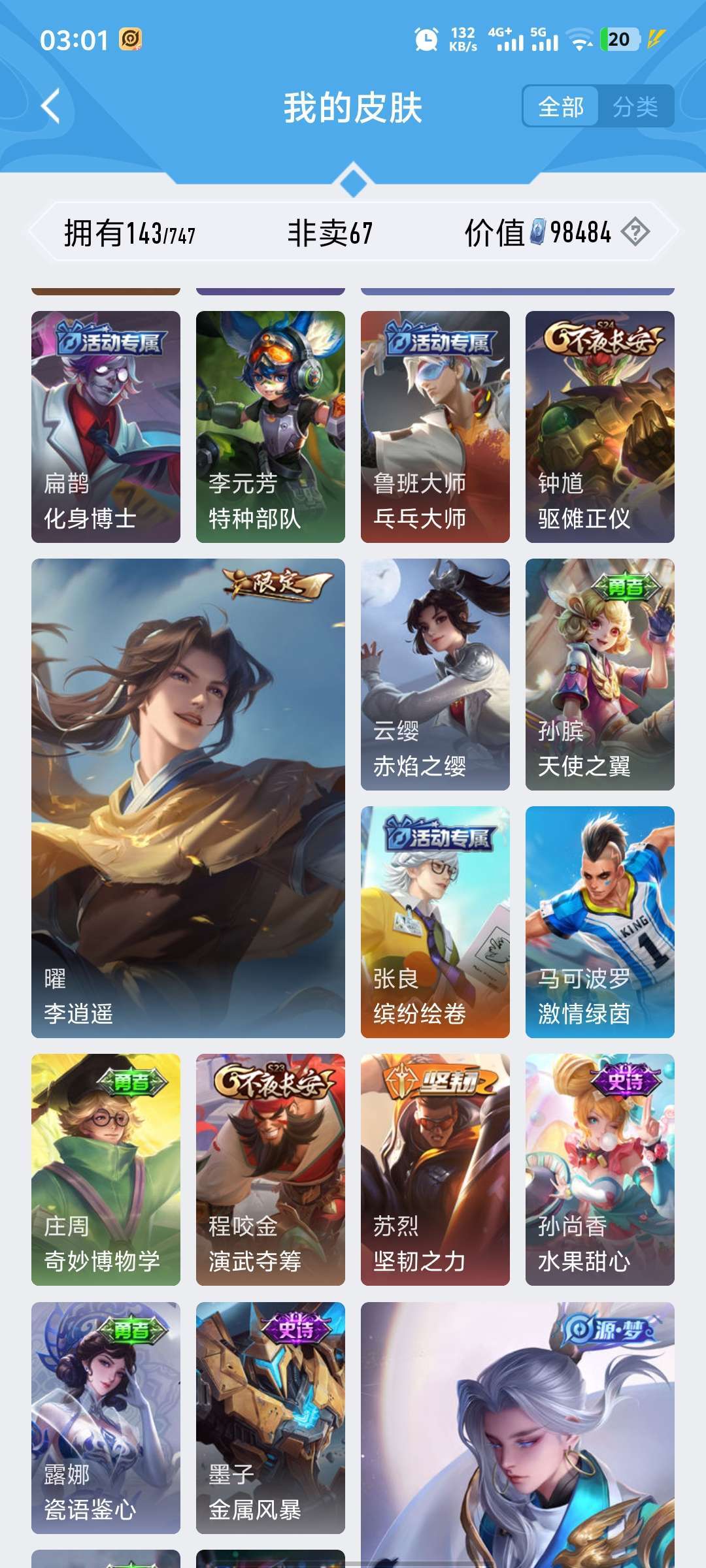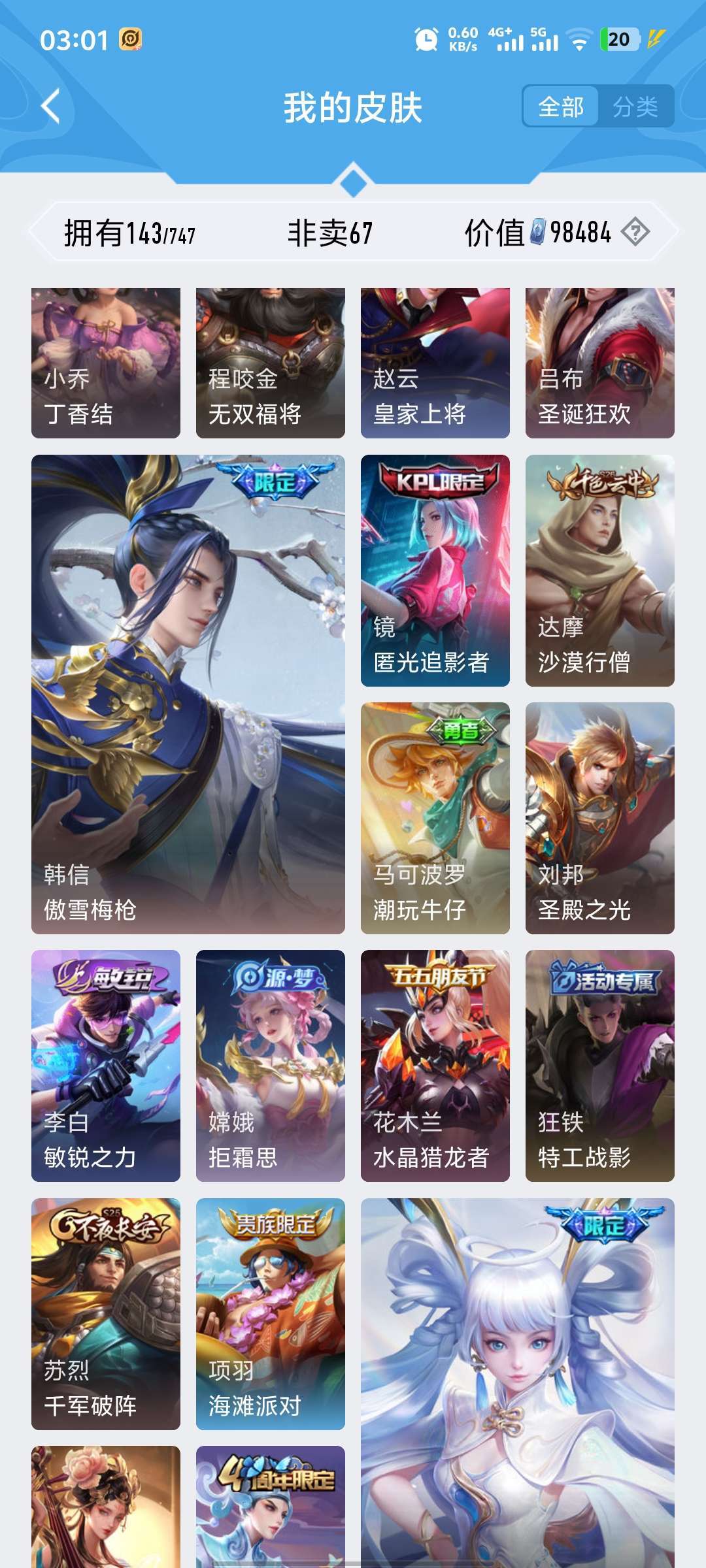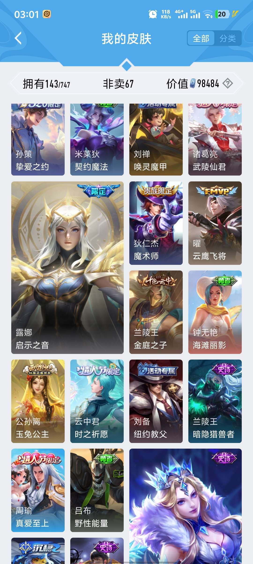 125英雄,143皮,可排位铂金一,武陵仙君❤️启示之音❤️李逍遥❤️傲雪梅枪❤️匿光追踪者❤️
