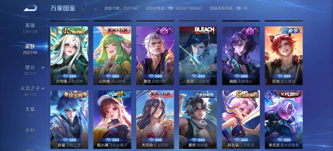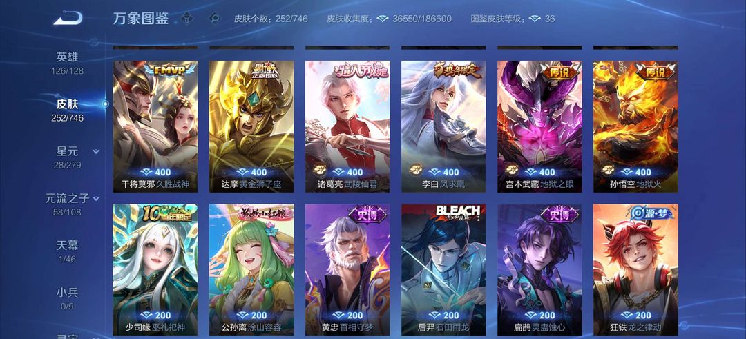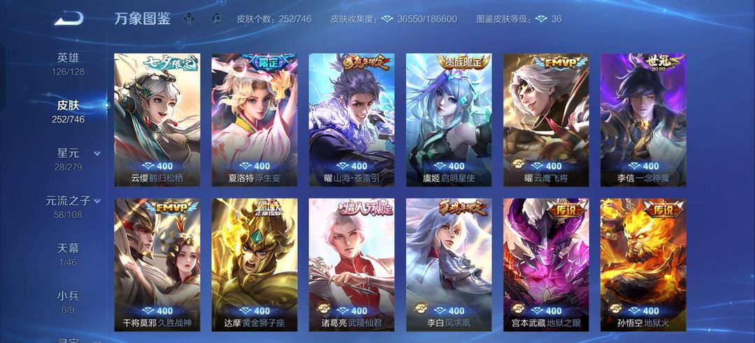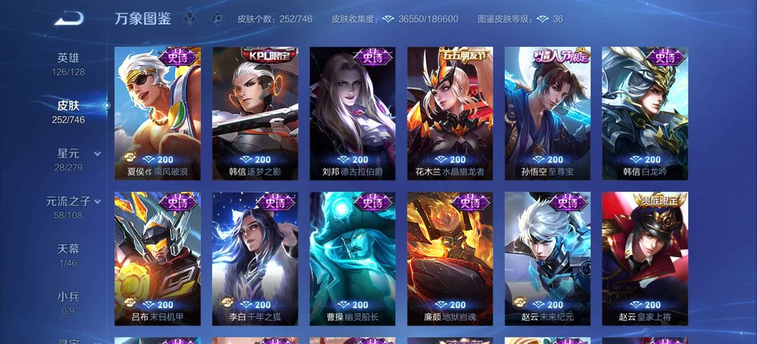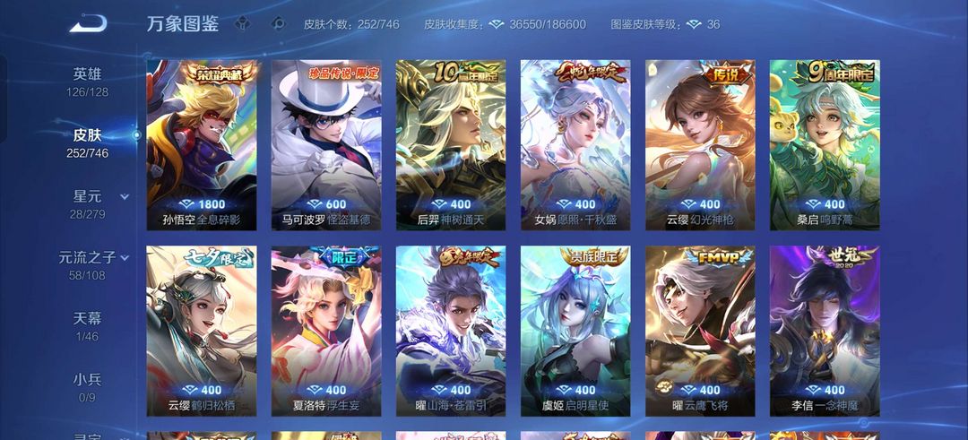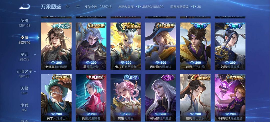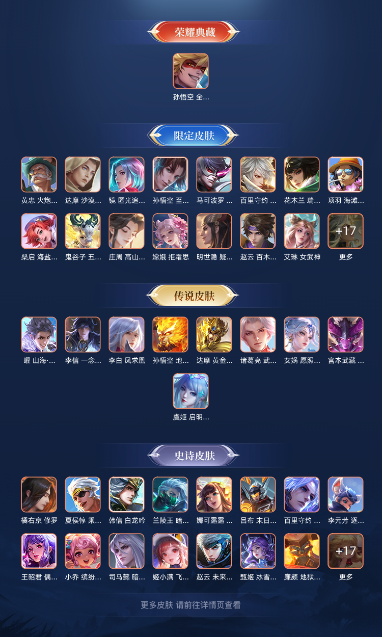 1典藏,1珍品,16传说,全息碎影,凤求凰,怪盗基德,一念神魔,武陵仙君等多优质皮肤。