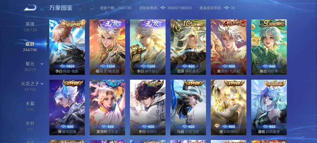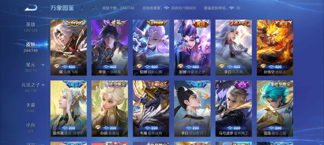 244皮肤一款荣耀典藏两款无双13款传说皮肤