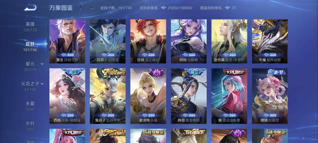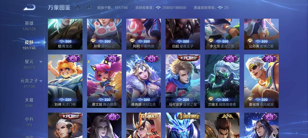 满套铭文,诸多热门皮肤。霜北刀,白虎志,青龙志,末日机甲,SNK史诗全套
