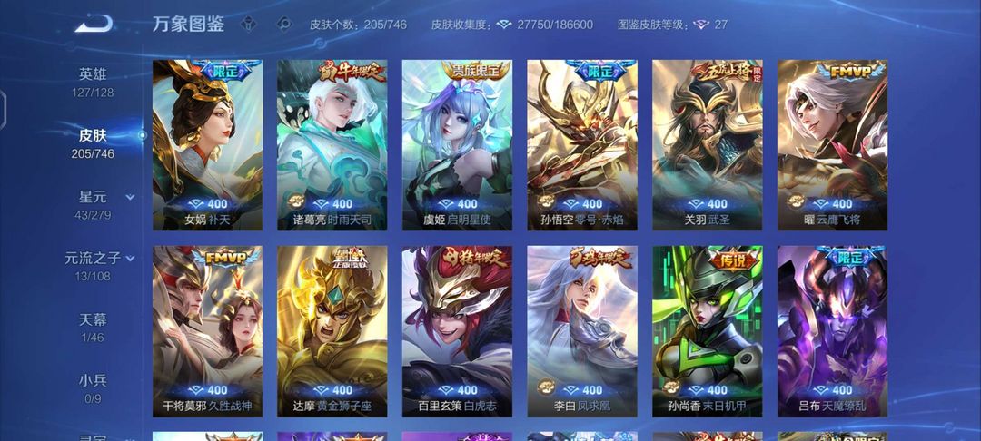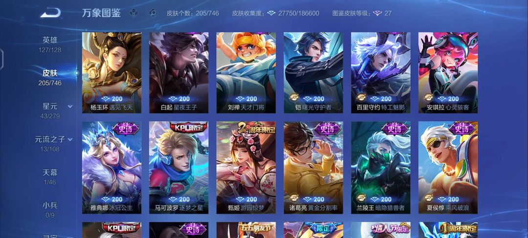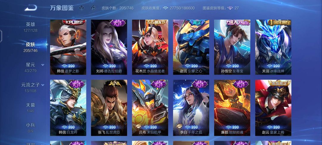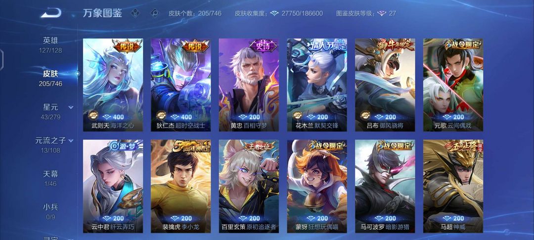 205皮肤 武则天•白虎•朱雀•冰封战神•至尊宝•引擎之心•天魔缭乱•岱宗•凤求凰•