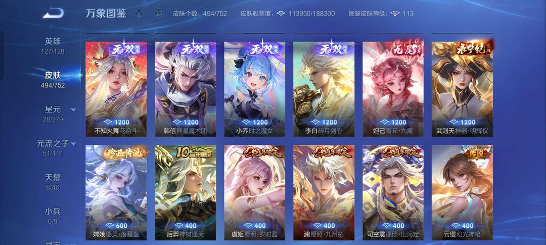 一共494个皮肤 基本所有英雄都有传说皮