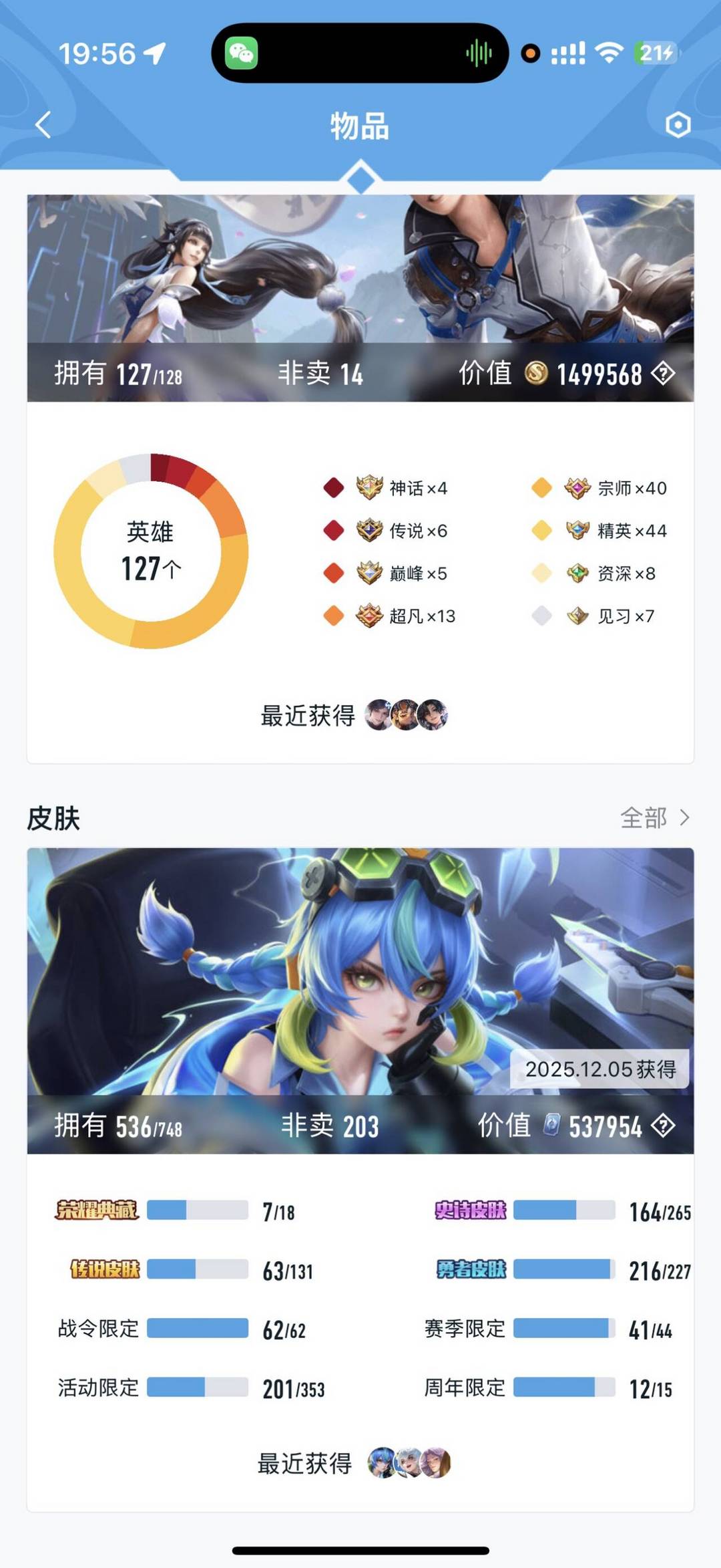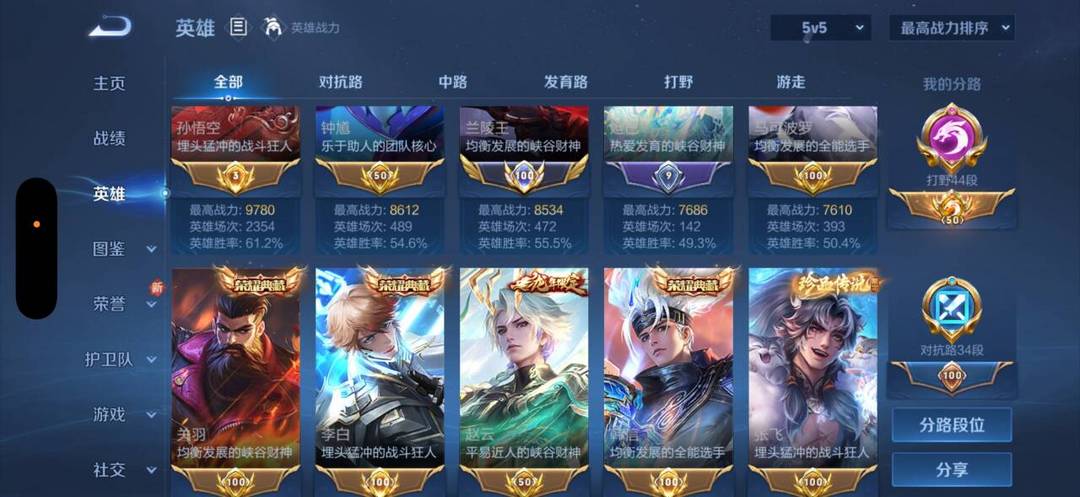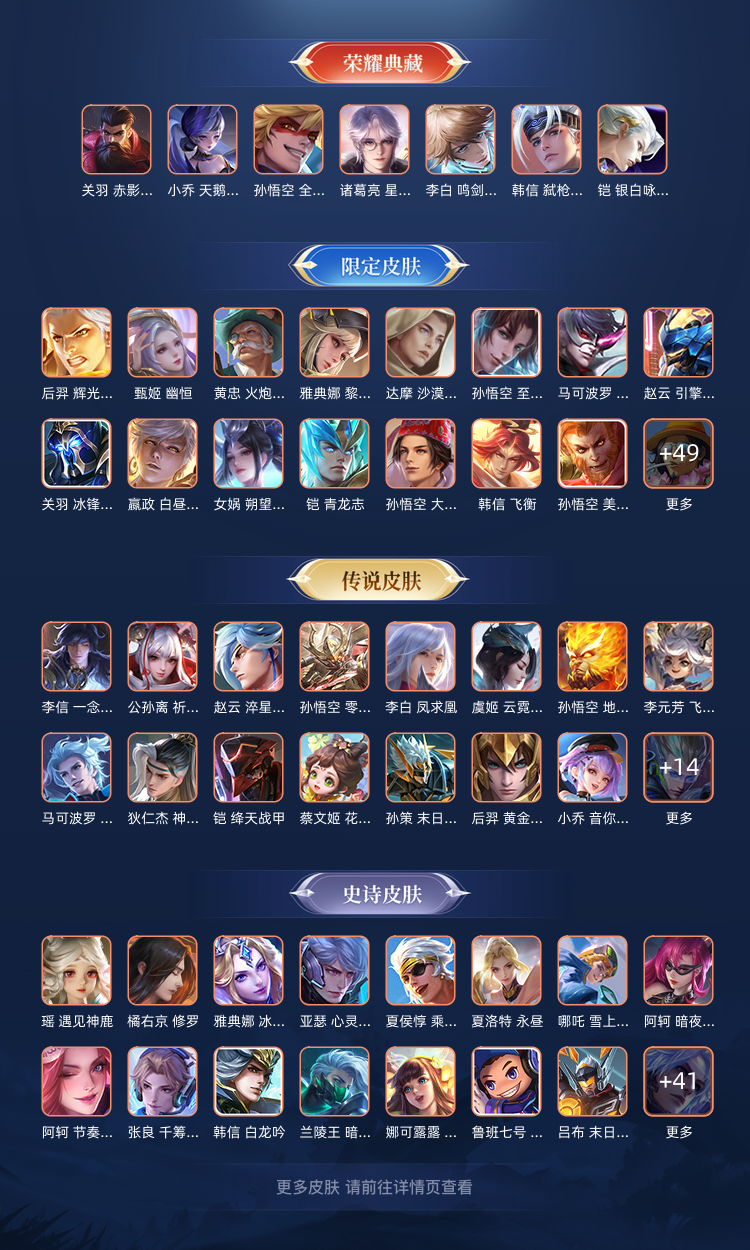 英雄:宫本武藏(宫本武藏 惊梅引,宫本武藏 地狱之眼,宫本武藏 未来纪元,宫本武藏 万象初新,宫本武藏 鬼剑武藏,宫本武藏 霸王丸);铠(铠 冥王哈迪斯,铠 绛天战甲,铠 龙域领主,铠 银白咏叹调,铠 曙光守护者,铠 青龙志);狂铁(狂铁 龙之律动,狂铁 电玩高手,狂铁 特工战影,狂铁 御狮,狂铁 命运角斗场);孙悟空(孙悟空 神迹守卫,孙悟空 齐天大圣,孙悟空 孙行者,孙悟空 全息碎影,孙悟空 零号·赤焰,孙悟空 大圣娶亲,孙悟空 地狱火,孙悟空 美猴王,孙悟空 至尊宝,孙悟空 西部大镖客);兰陵王(兰陵王 傩神司,兰陵王 影龙天霄,兰陵王 幻夜行动,兰陵王 隐刃,兰陵王 金庭之子,兰陵王 驯魔猎人,兰陵王 暗隐猎兽者);杨戬(杨戬 破阵·退雄兵,杨戬 天秀·启明,杨戬 潮玩骑兵,杨戬 次元傲视,杨戬 埃及法老);马可波罗(马可波罗 怪盗基德,马可波罗 星界特工,马可波罗 深海之息,马可波罗 潮玩牛仔,马可波罗 暗影游猎,马可波罗 激情绿茵);吕布(吕布 逐霄战戟,吕布 曦玄引,吕布 末日机甲,吕布 怒海麟威,吕布 野性能量,吕布 猎兽之王,吕布 圣诞狂欢);妲己(妲己 愿照·众生和