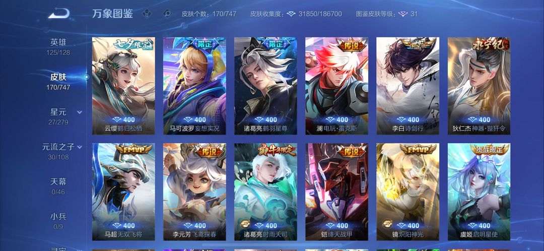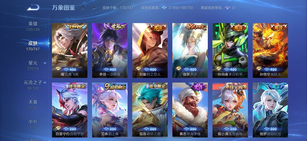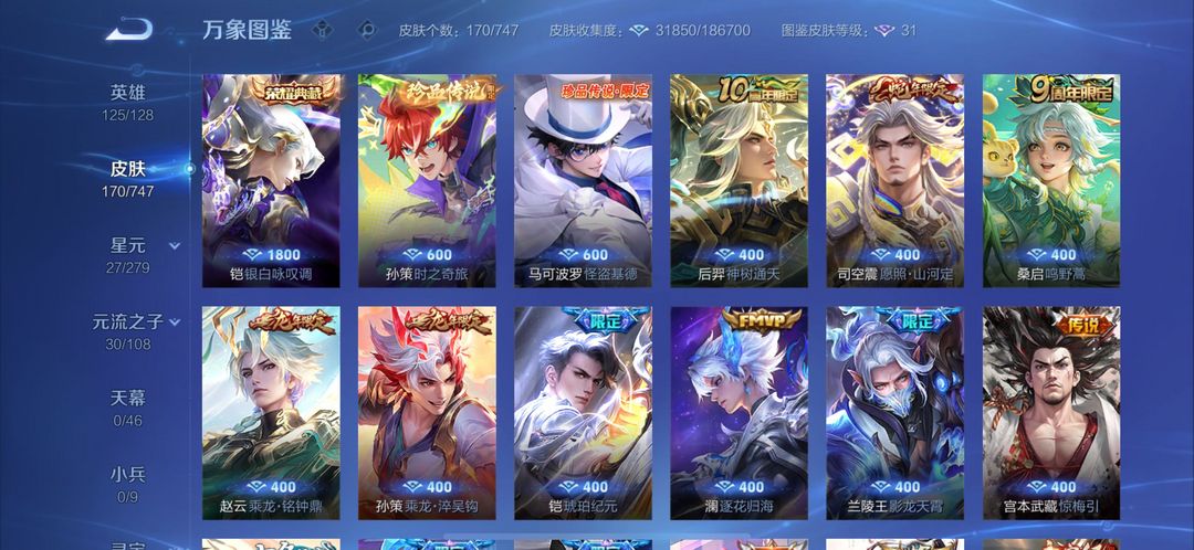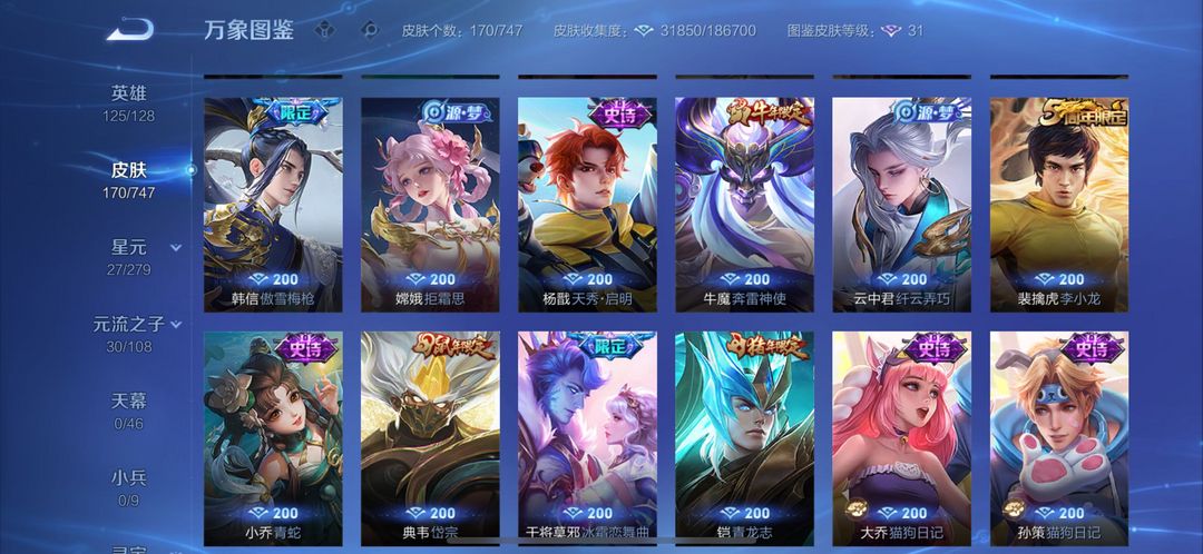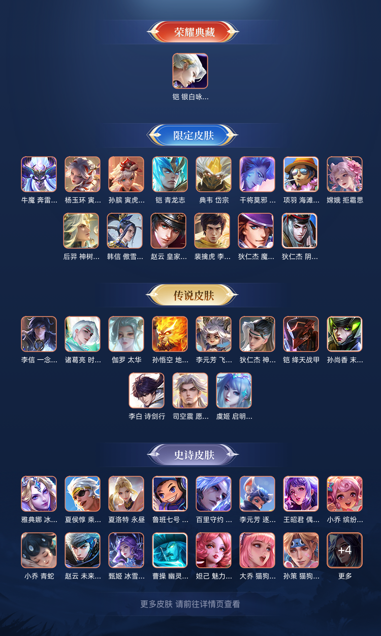 荣耀典藏*1 传说皮肤*27 史诗皮肤*53 战令限定*11 活动限定*58 禁止利用账号进行开挂、使用辅助违规软件诈骗等违规操作。