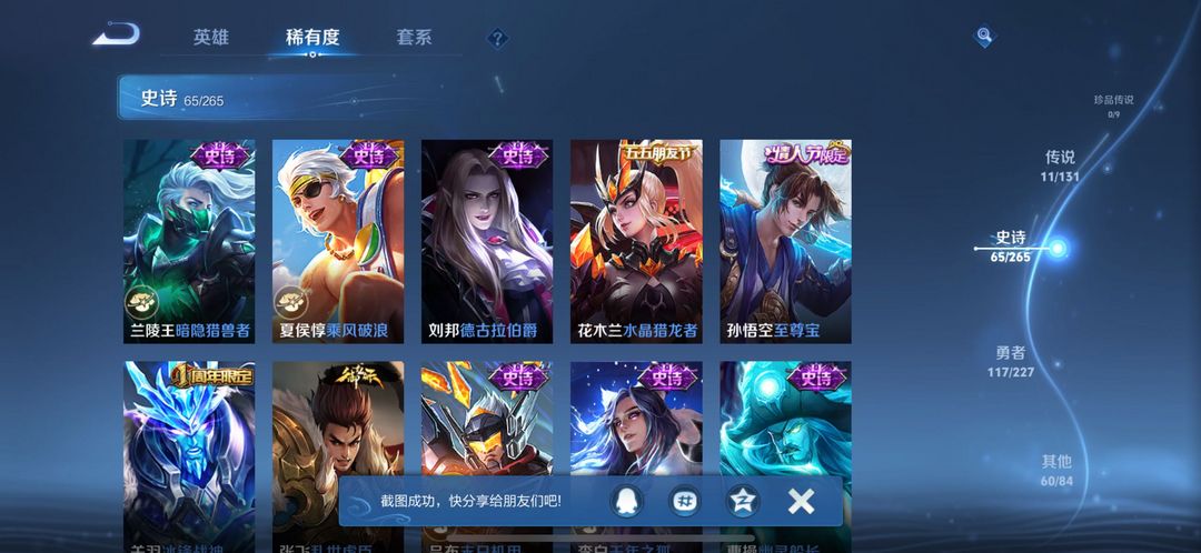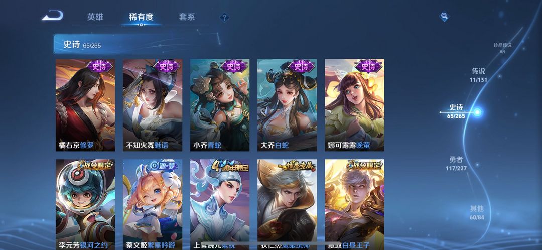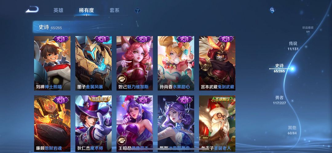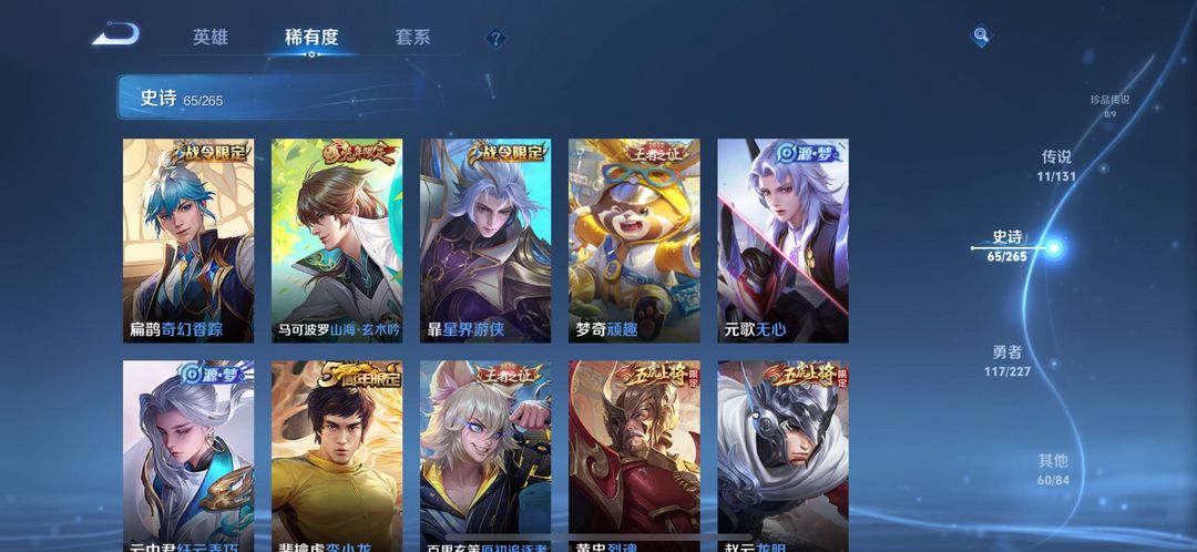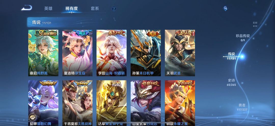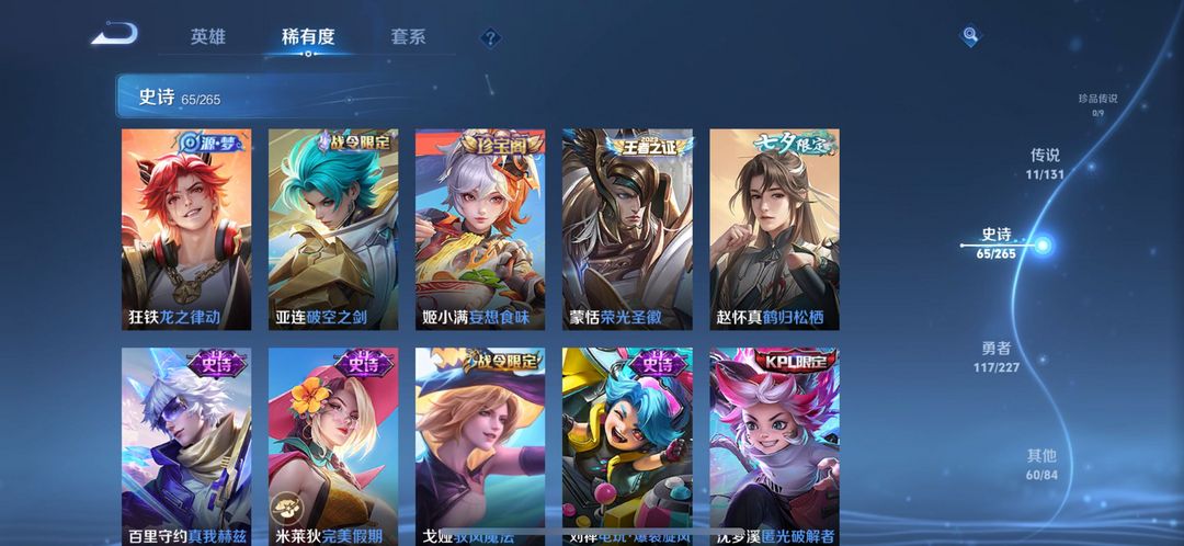 花木兰(荣耀典藏)孙策(末日机甲)杨戬(永耀之星)老夫子(圣诞老人)关羽(武圣,冰封战神)赵怀真(鹤归松栖)曹操(幽灵船长)夏洛特(浮生妄)赵云(龙胆)达摩(狮子座)李信(炽霜斩)亚瑟(狮心王)猴子(至尊宝)玄策(白虎志)貂蝉(猫影幻舞)沈梦溪(kpl限定)干将莫邪(久胜战神)孙尚香(末日机甲星传说)百里守约(真我赫滋)鲁班(电玩)黄忠(猎魂)马可波罗(玄木吟)