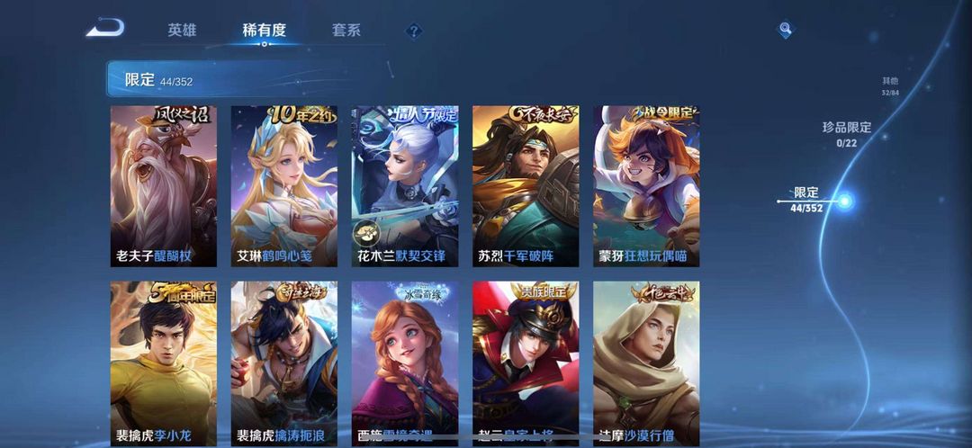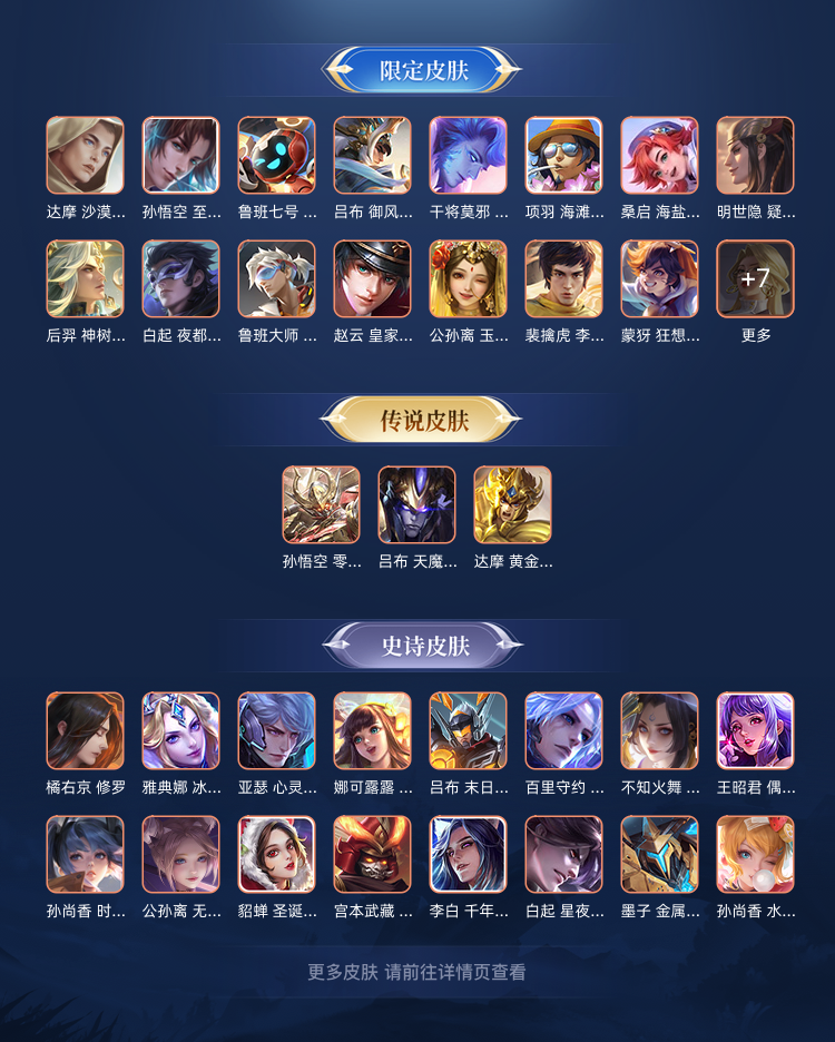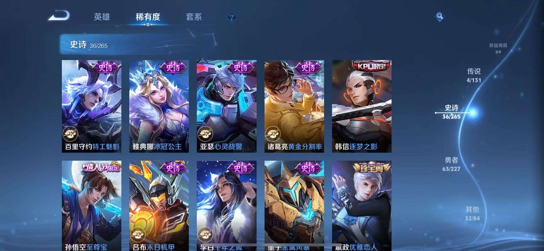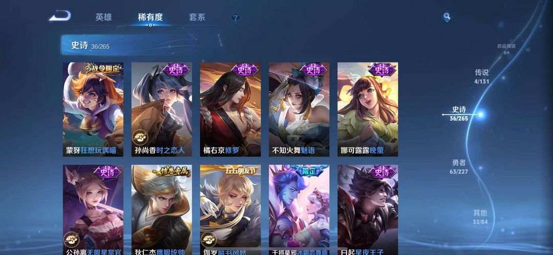这个账号有4个传说、36个史诗和16个限定皮肤,至尊宝、天魔缭乱等热门限定都在,皮肤阵容丰富,价值感满满,能带来多样游戏体验。