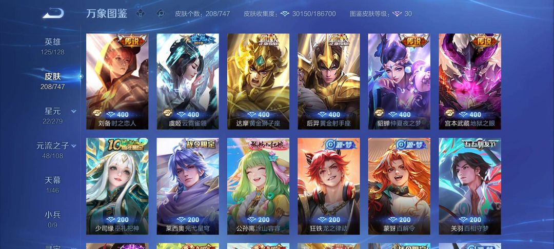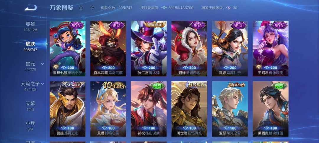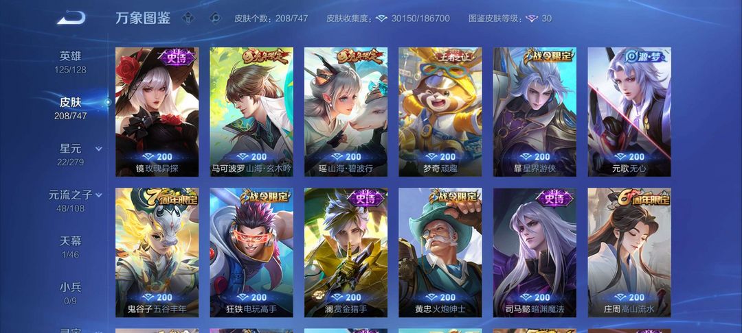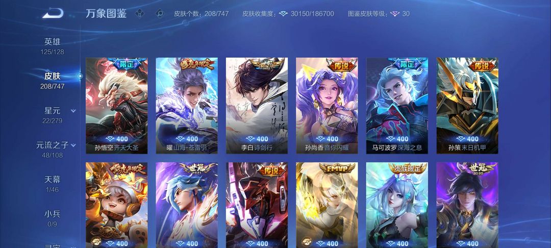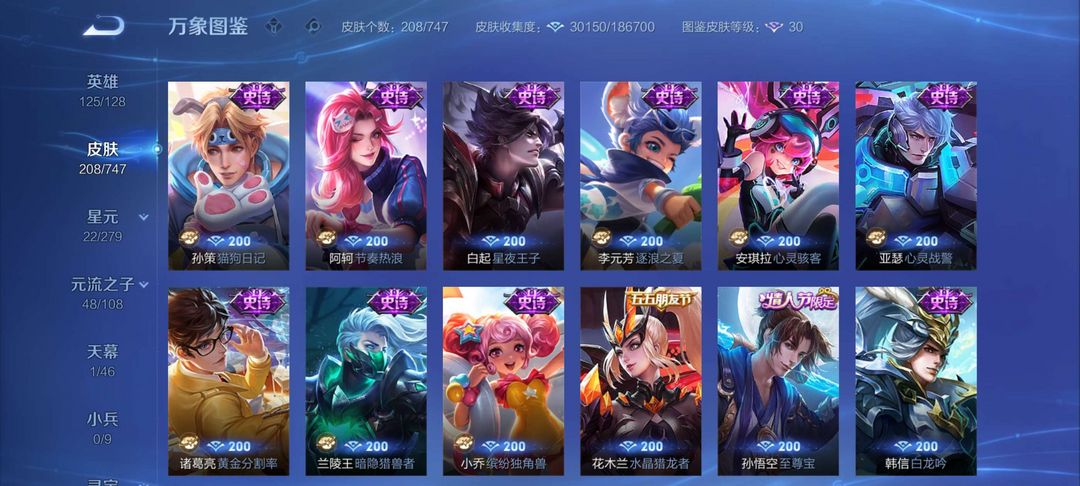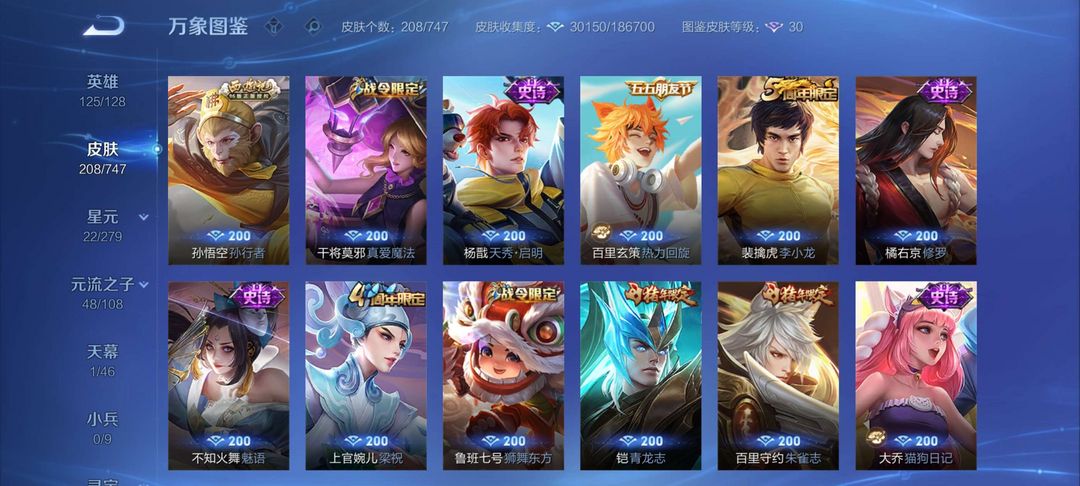 王者荣耀无双王者208皮猴子差几个全皮整体号还是不错的因为从很小就开始玩了基本热门的东西都有