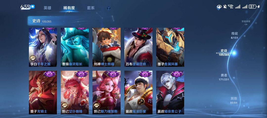 史诗皮肤更是达到了105个,涵盖了各种热门限定,如安琪拉的魔法小厨娘、孙悟空的孙行者、公孙离的蜜橘之夏等。几乎每个热门英雄都有拿得出手的皮肤,如孙尚香的蔷薇恋人、李白的千年之狐、韩信的白龙吟等。