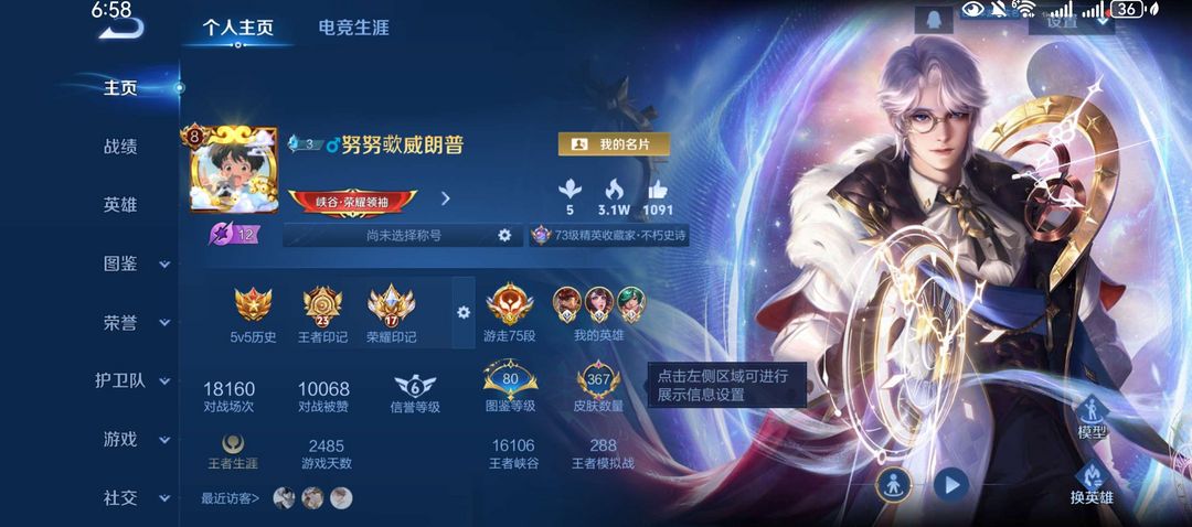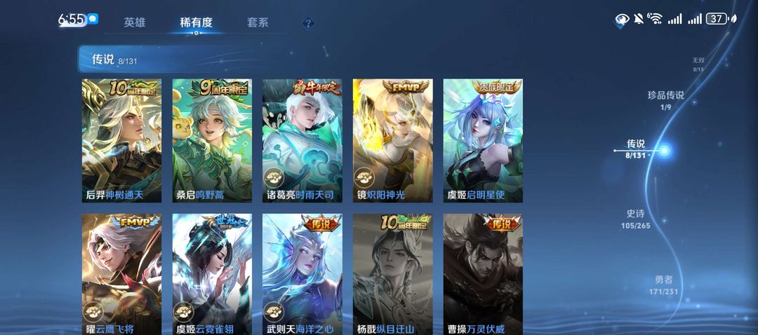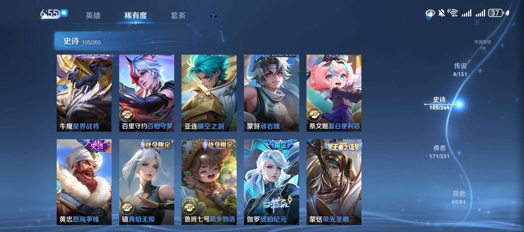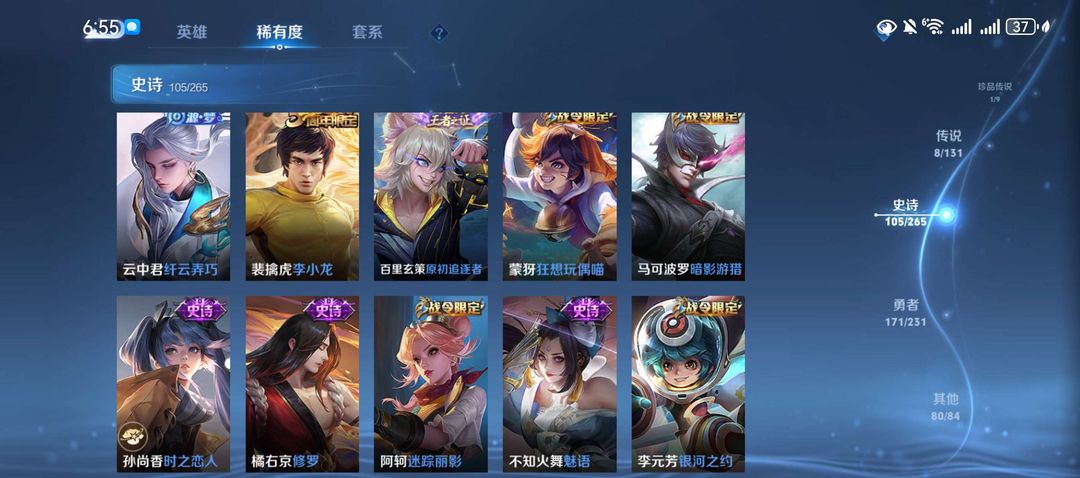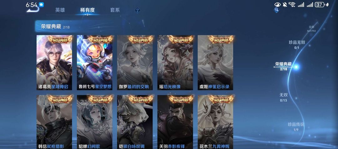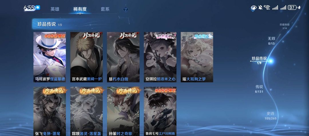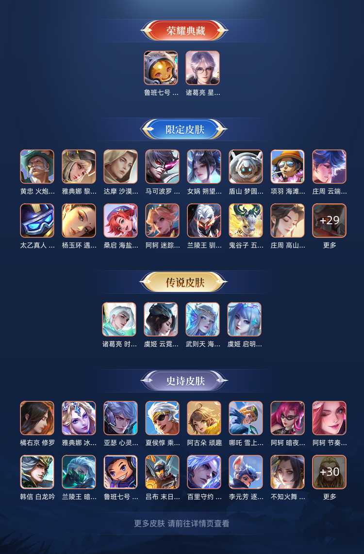这个账号的排面直接拉满!拥有2个荣耀典藏皮肤,包括诸葛亮的星域神启和鲁班七号的星空梦想。此外,还有1个珍品传说(马可波罗的怪盗基德)和8个传说皮肤,如后羿的神树通天、诸葛亮的时雨天司等。